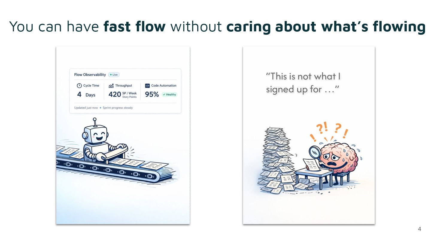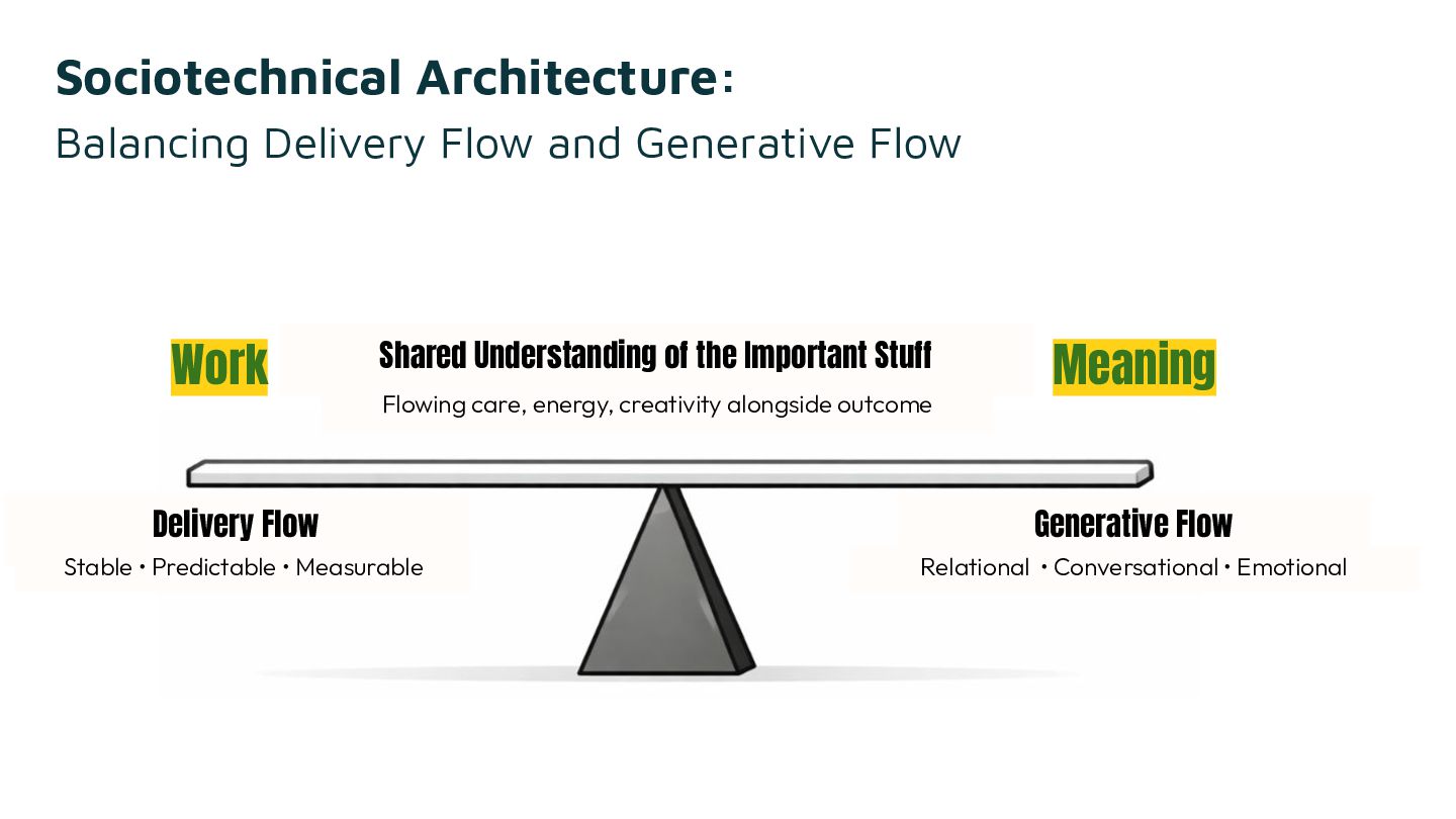 There is more than one kind of flow. One shows up as cycle times, feature throughput, WIP limits. The other moves through people: the energy in a room when genuine thinking is happening, the question nobody planned for that opens a better direction, the feeling of pulling weight toward something that matters. These two flows need each other. Optimize one while starving the other, and something breaks, even when all the metrics look fine.
