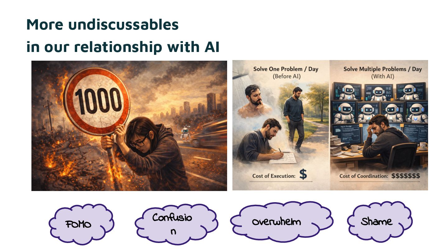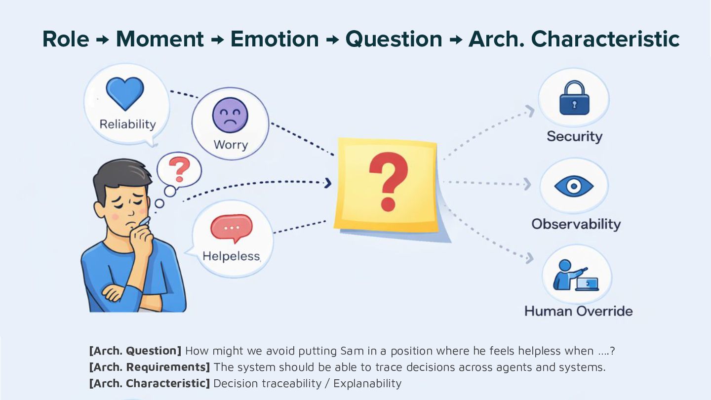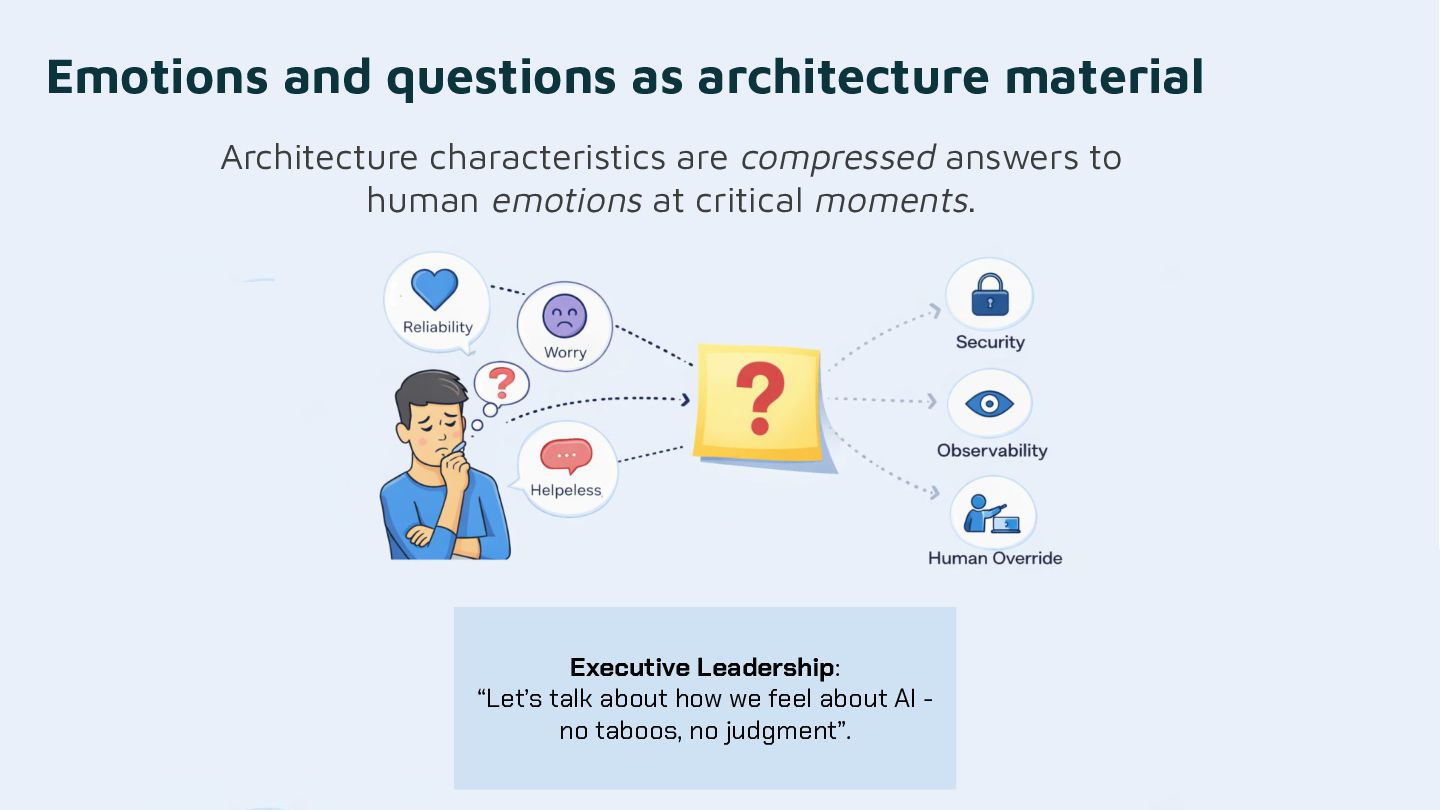- How emotions, questions, and conversations function as architecture material, not soft add-ons
