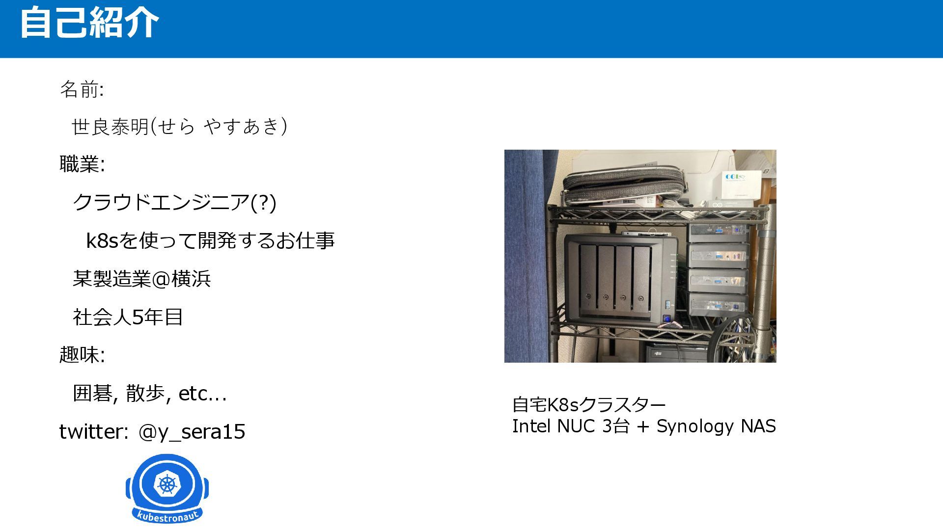 囲碁, 散歩, etc... twitter: @y_sera15 自宅K8sクラスター Intel NUC 3台 + Synology NAS