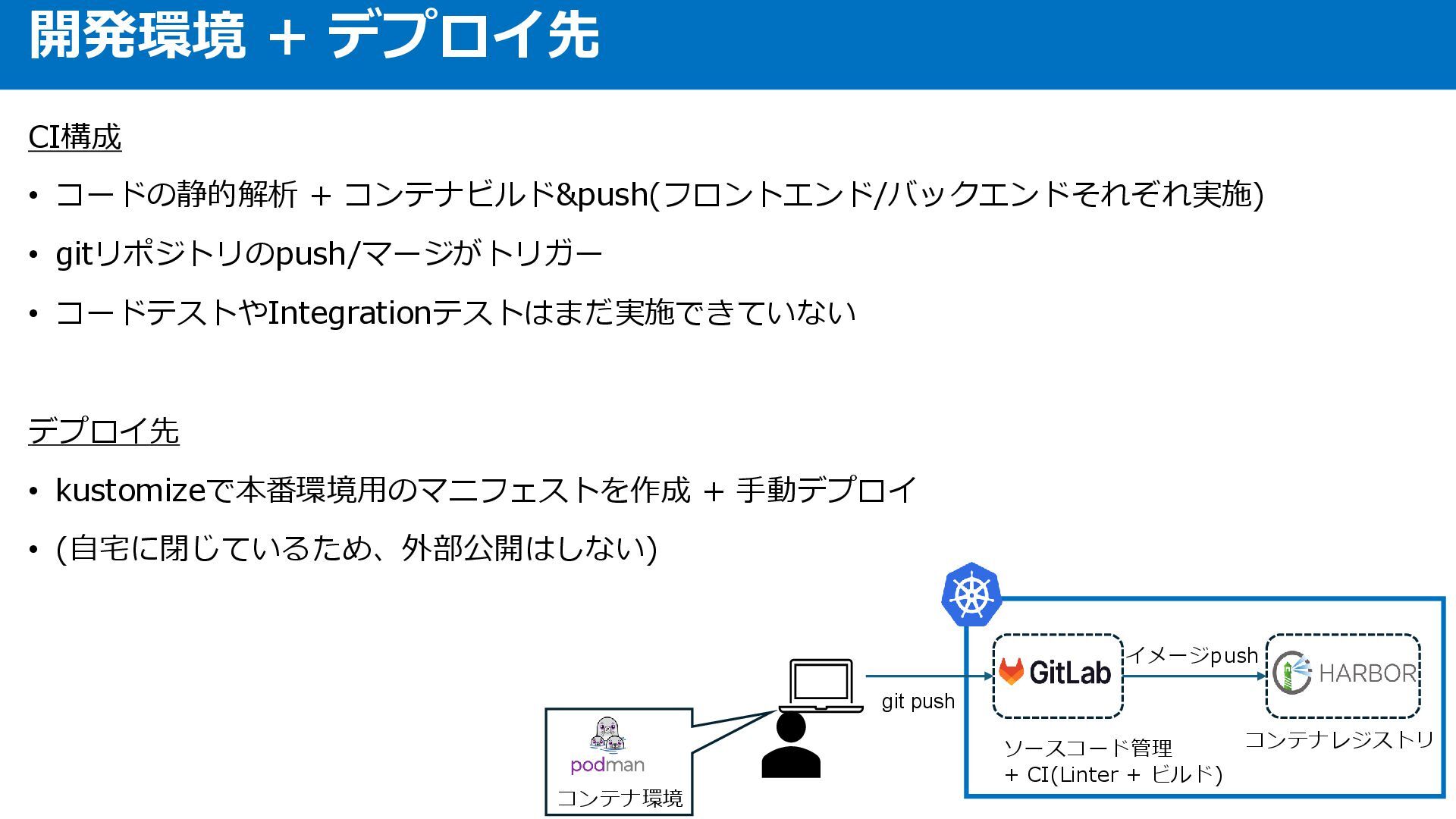 • kustomizeで本番環境用のマニフェストを作成 + 手動デプロイ • (自宅に閉じているため、外部公開はしない) 開発環境 + デプロイ先 イメージpush ソースコード管理 + CI(Linter + ビルド) コンテナレジストリ コンテナ環境 git push