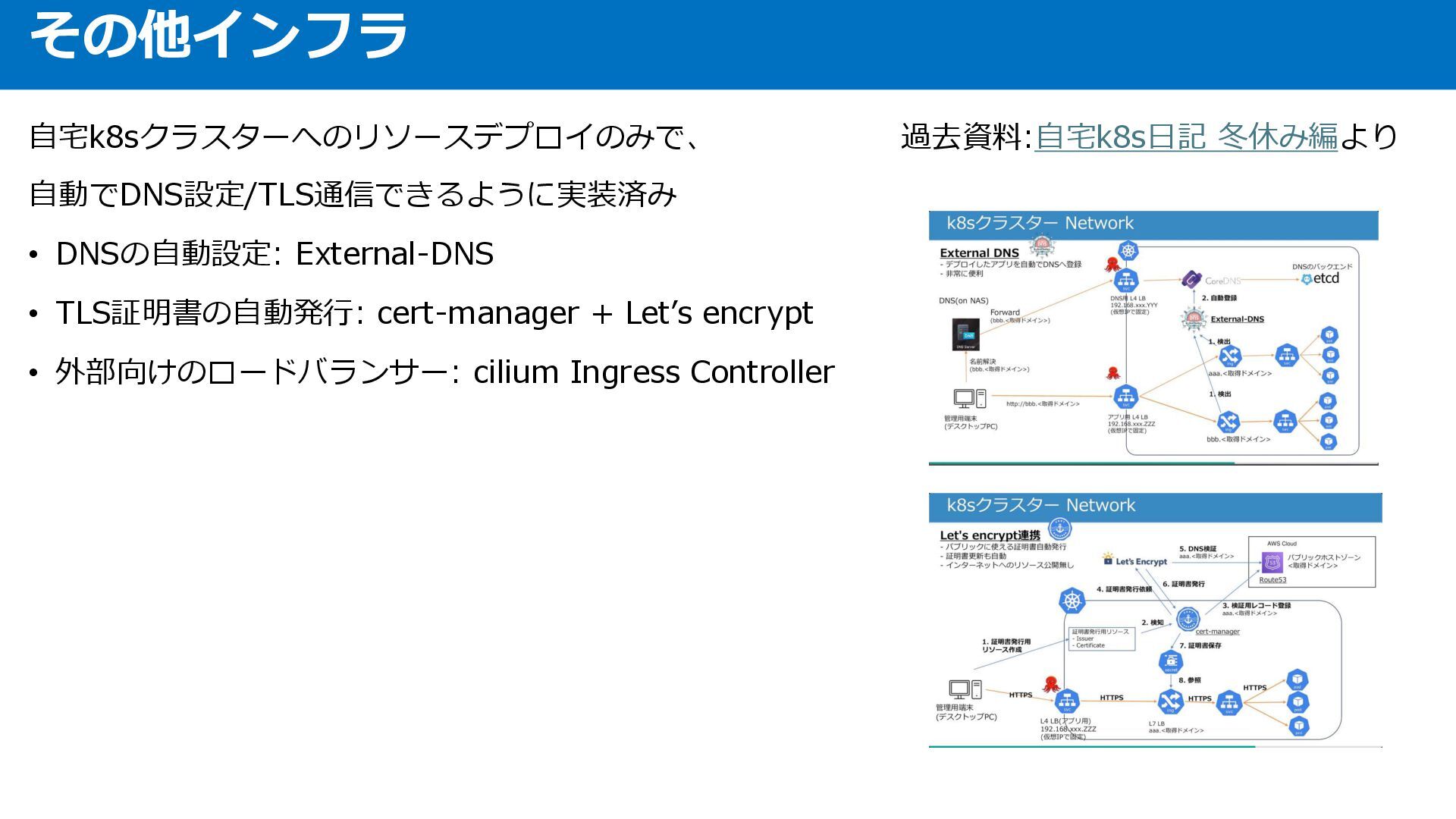 Let’s encrypt • 外部向けのロードバランサー: cilium Ingress Controller 過去資料:自宅k8s日記 冬休み編より