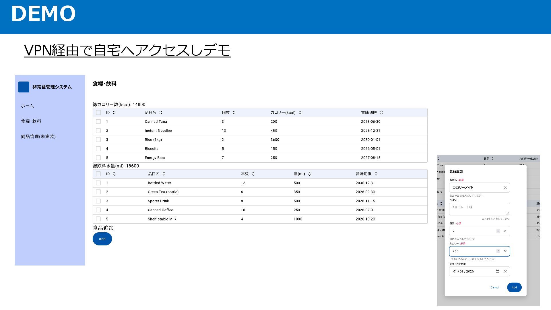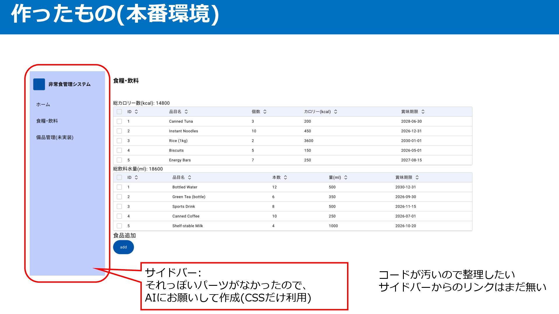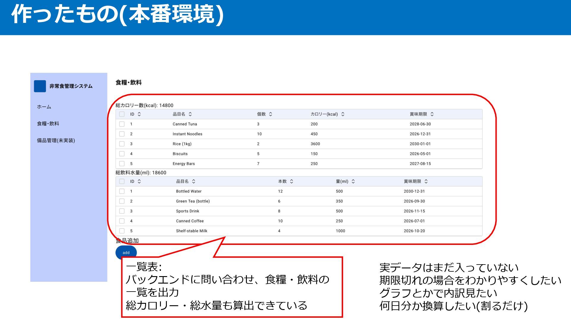 作ったもの(本番環境) 一覧表: バックエンドに問い合わせ、食糧・飲料の 一覧を出力 総カロリー・総水量も算出できている 実データはまだ入っていない 期限切れの場合をわかりやすくしたい グラフとかで内訳見たい 何日分か換算したい(割るだけ)
