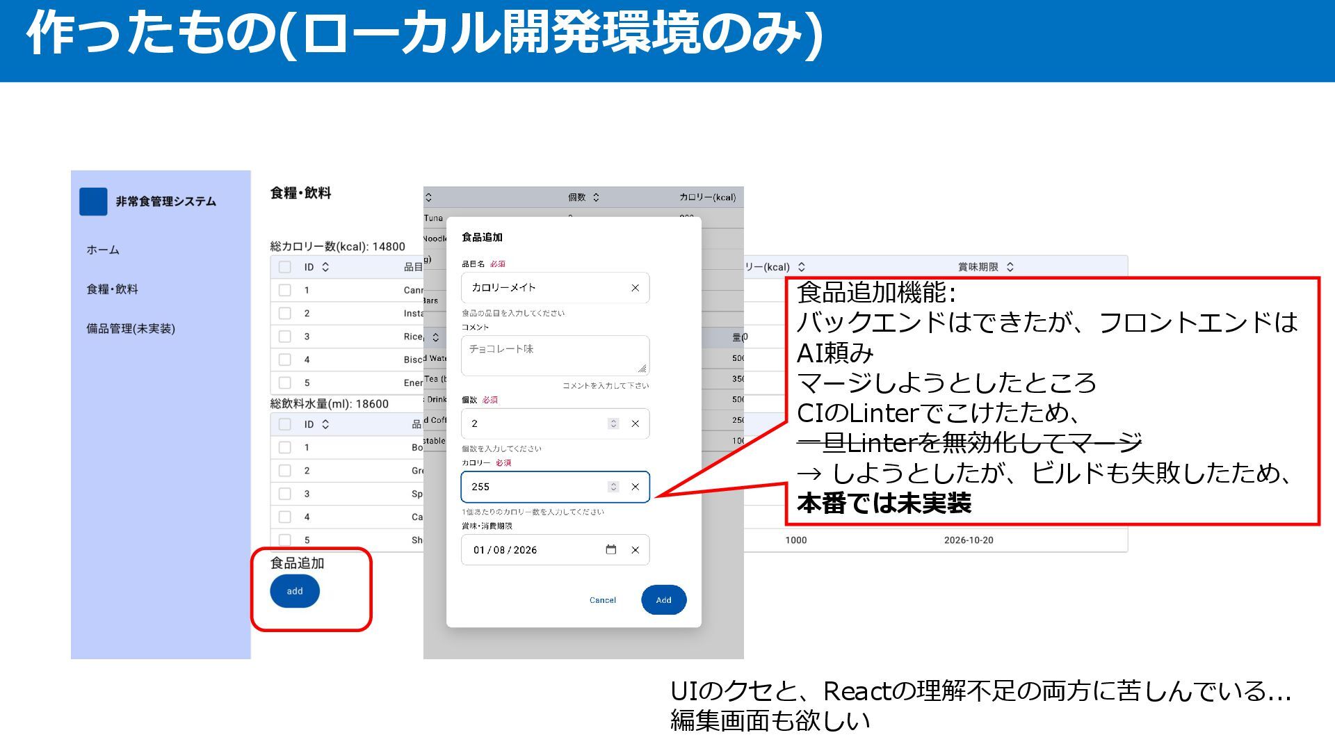 作ったもの(ローカル開発環境のみ) 食品追加機能: バックエンドはできたが、フロントエンドは AI頼み マージしようとしたところ CIのLinterでこけたため、 一旦Linterを無効化してマージ → しようとしたが、ビルドも失敗したため、 本番では未実装