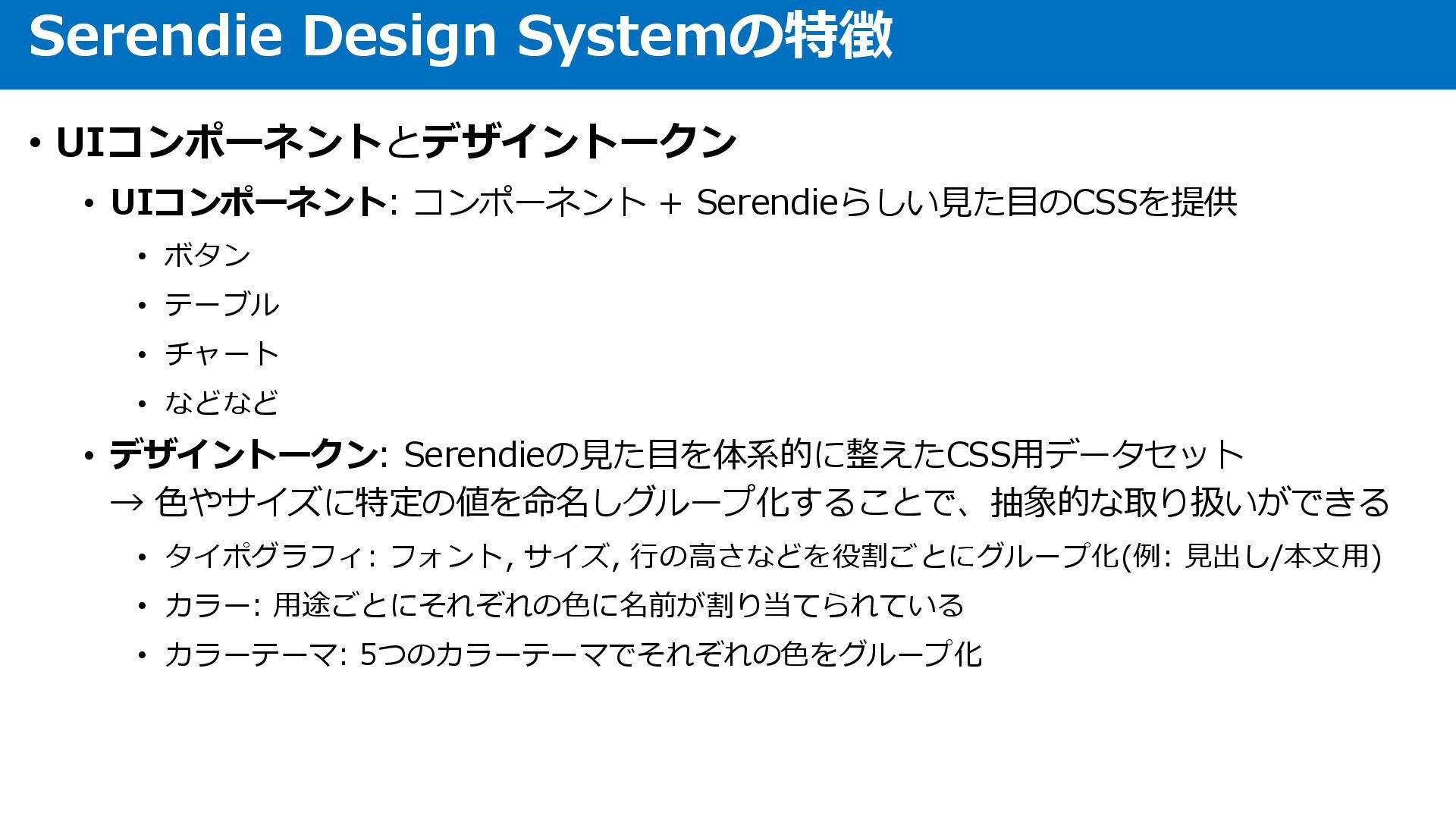 テーブル • チャート • などなど • デザイントークン: Serendieの見た目を体系的に整えたCSS用データセット → 色やサイズに特定の値を命名しグループ化することで、抽象的な取り扱いができる • タイポグラフィ: フォント, サイズ, 行の高さなどを役割ごとにグループ化(例: 見出し/本文用) • カラー: 用途ごとにそれぞれの色に名前が割り当てられている • カラーテーマ: 5つのカラーテーマでそれぞれの色をグループ化 Serendie Design Systemの特徴