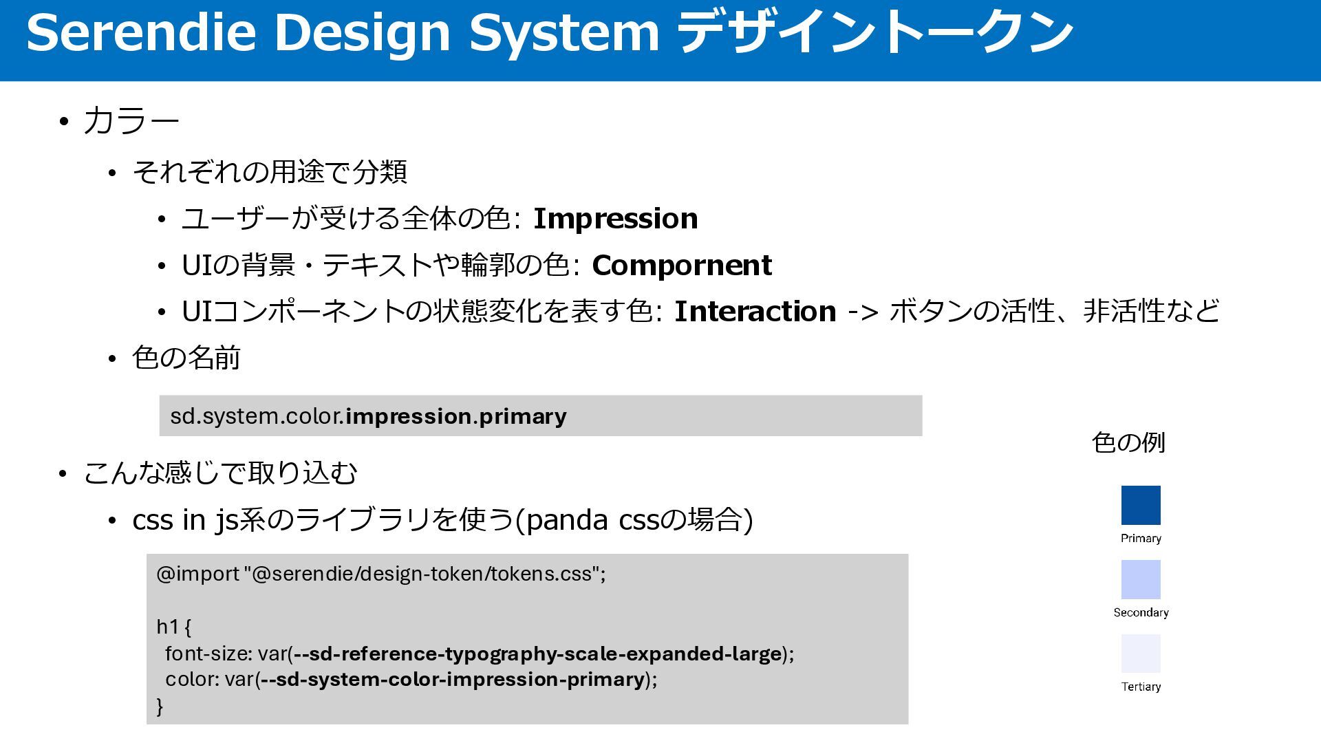 • UIコンポーネントの状態変化を表す色: Interaction -> ボタンの活性、非活性など • 色の名前 • こんな感じで取り込む • css in js系のライブラリを使う(panda cssの場合) Serendie Design System デザイントークン sd.system.color.impression.primary 色の例 @import "@serendie/design-token/tokens.css"; h1 { font-size: var(--sd-reference-typography-scale-expanded-large); color: var(--sd-system-color-impression-primary); }