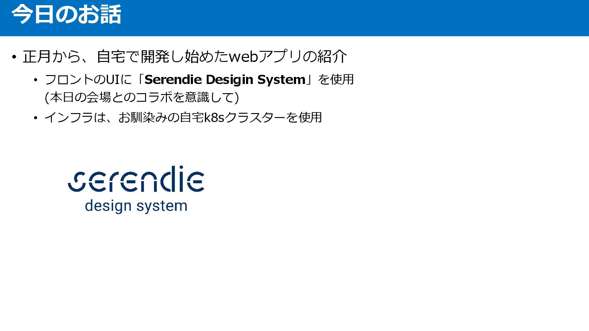 • 正月から、自宅で開発し始めたwebアプリの紹介 • フロントのUIに「Serendie Desigin System」を使用 (本日の会場とのコラボを意識して) • インフラは、お馴染みの自宅k8sクラスターを使用 今日のお話