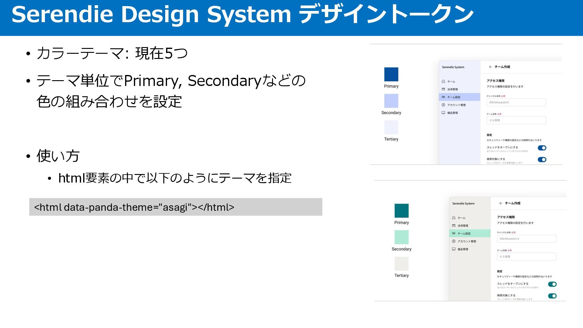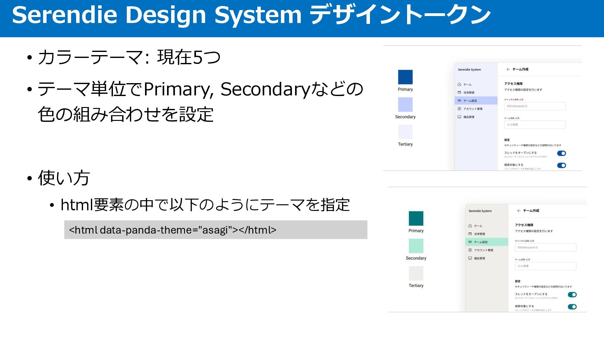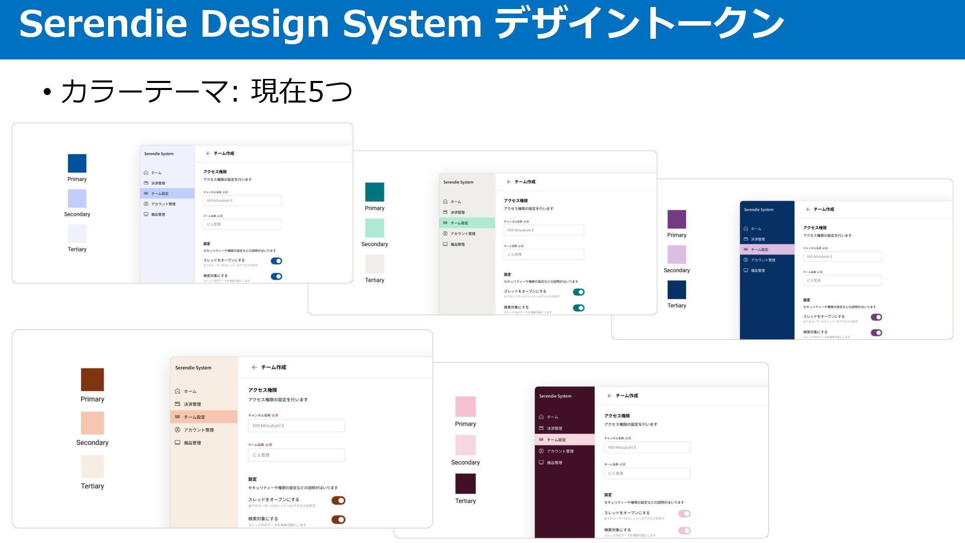 • カラーテーマ: 現在5つ Serendie Design System デザイントークン