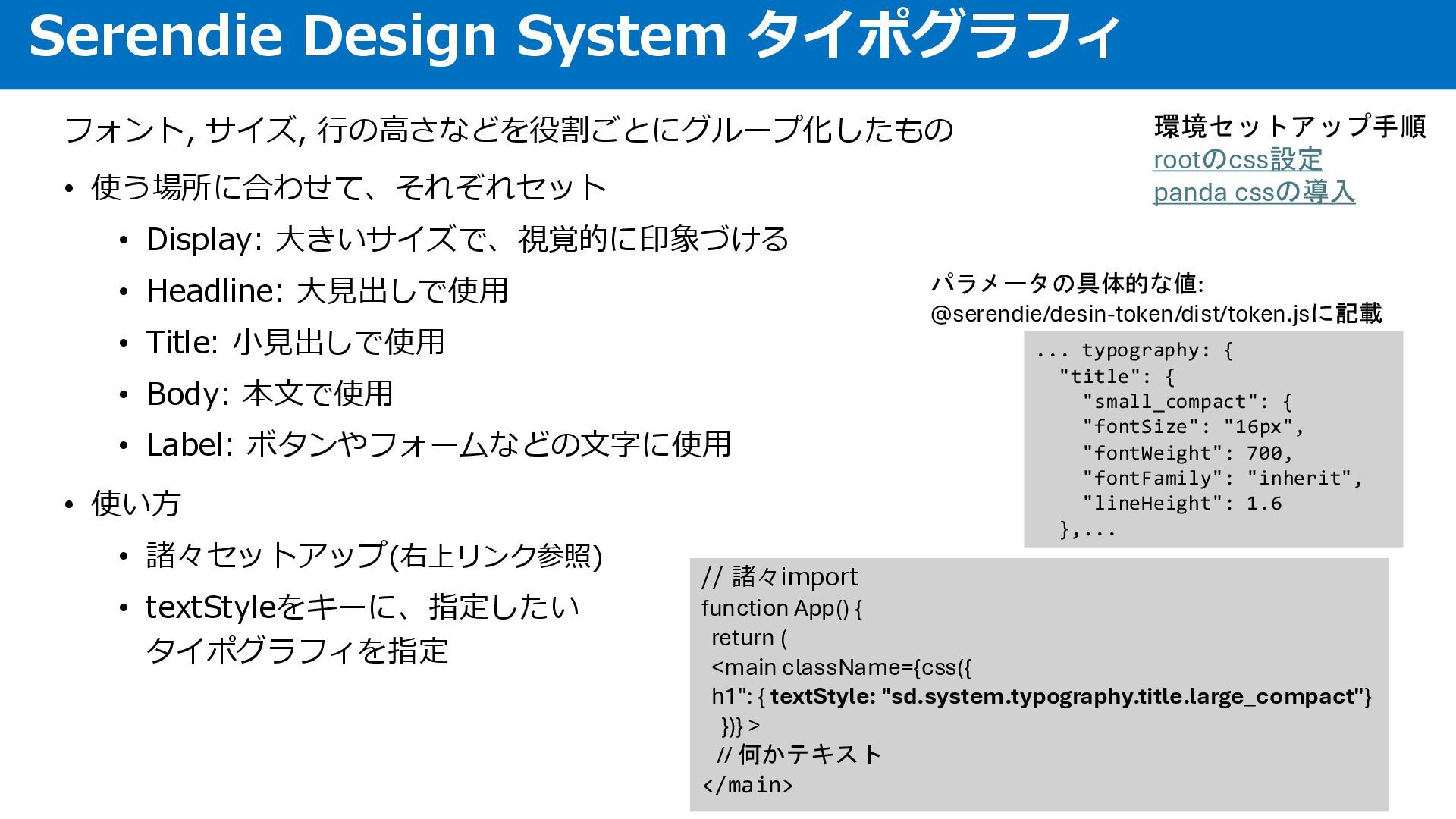 大見出しで使用 • Title: 小見出しで使用 • Body: 本文で使用 • Label: ボタンやフォームなどの文字に使用 • 使い方 • 諸々セットアップ(右上リンク参照) • textStyleをキーに、指定したい タイポグラフィを指定 Serendie Design System タイポグラフィ // 諸々import function App() { return ( <main className={css({ h1": { textStyle: "sd.system.typography.title.large_compact"} })} > // 何かテキスト </main> 環境セットアップ手順 rootのcss設定 panda cssの導入 ... typography: { "title": { "small_compact": { "fontSize": "16px", "fontWeight": 700, "fontFamily": "inherit", "lineHeight": 1.6 },... パラメータの具体的な値: @serendie/desin-token/dist/token.jsに記載
