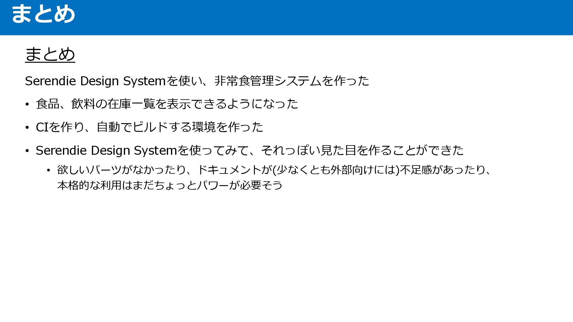 まとめ Serendie Design Systemを使い、非常食管理システムを作った • 食品、飲料の在庫一覧を表示できるようになった • CIを作り、自動でビルドする環境を作った • Serendie