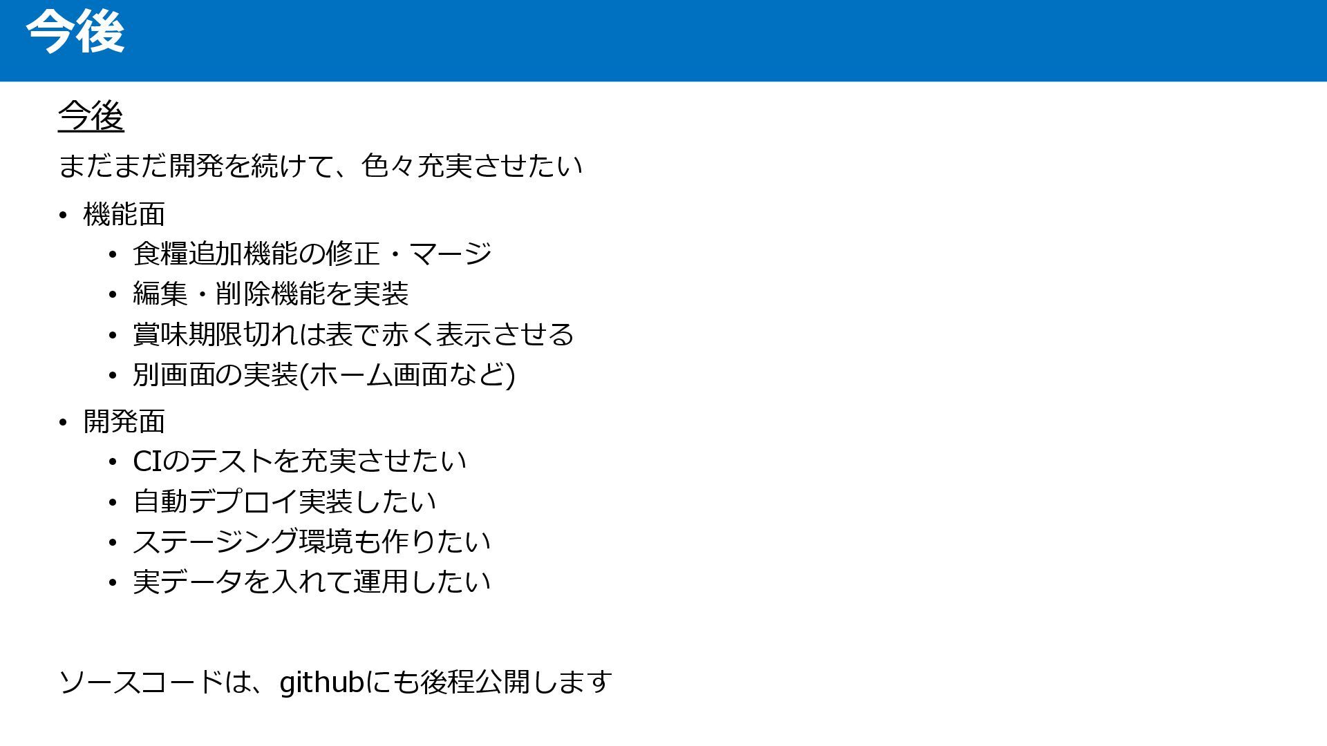 • 別画面の実装(ホーム画面など) • 開発面 • CIのテストを充実させたい • 自動デプロイ実装したい • ステージング環境も作りたい • 実データを入れて運用したい ソースコードは、githubにも後程公開します 今後