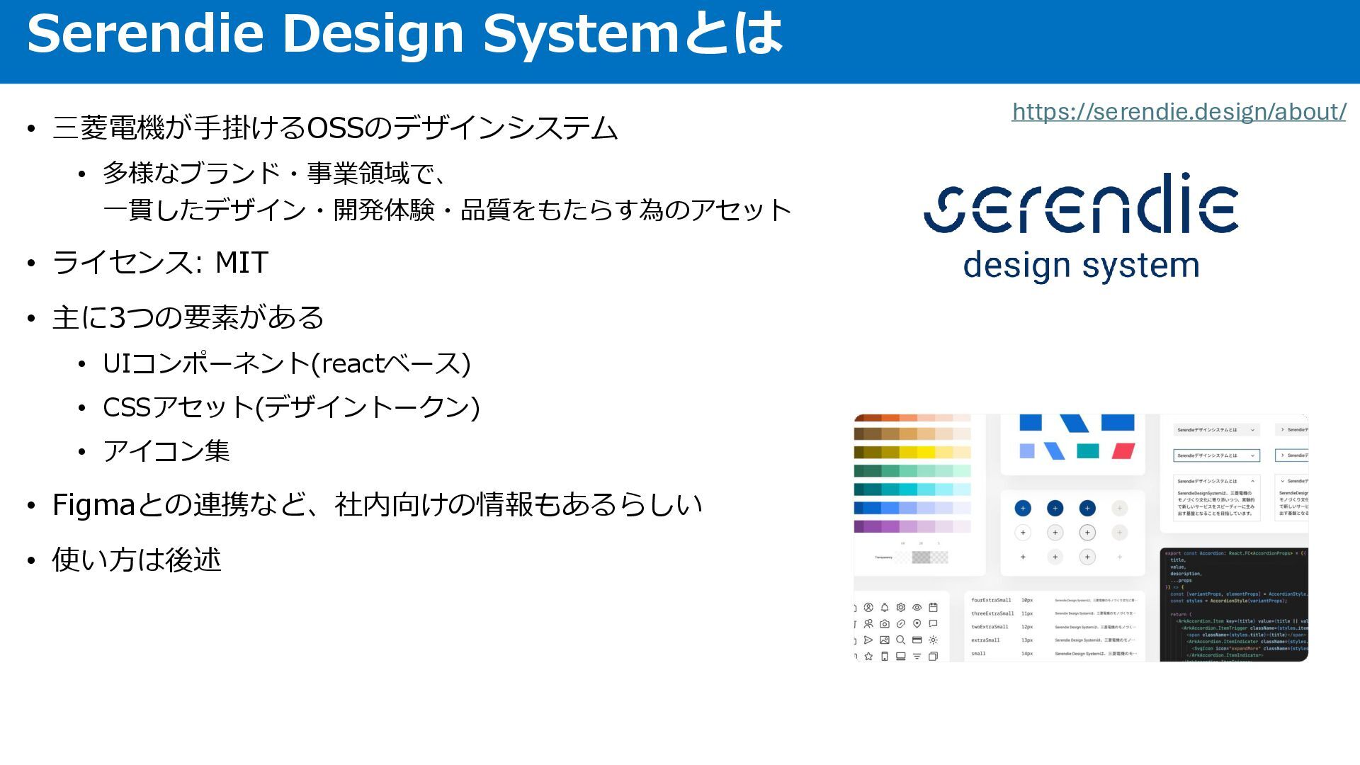 • UIコンポーネント(reactベース) • CSSアセット(デザイントークン) • アイコン集 • Figmaとの連携など、社内向けの情報もあるらしい • 使い方は後述 Serendie Design Systemとは https://serendie.design/about/