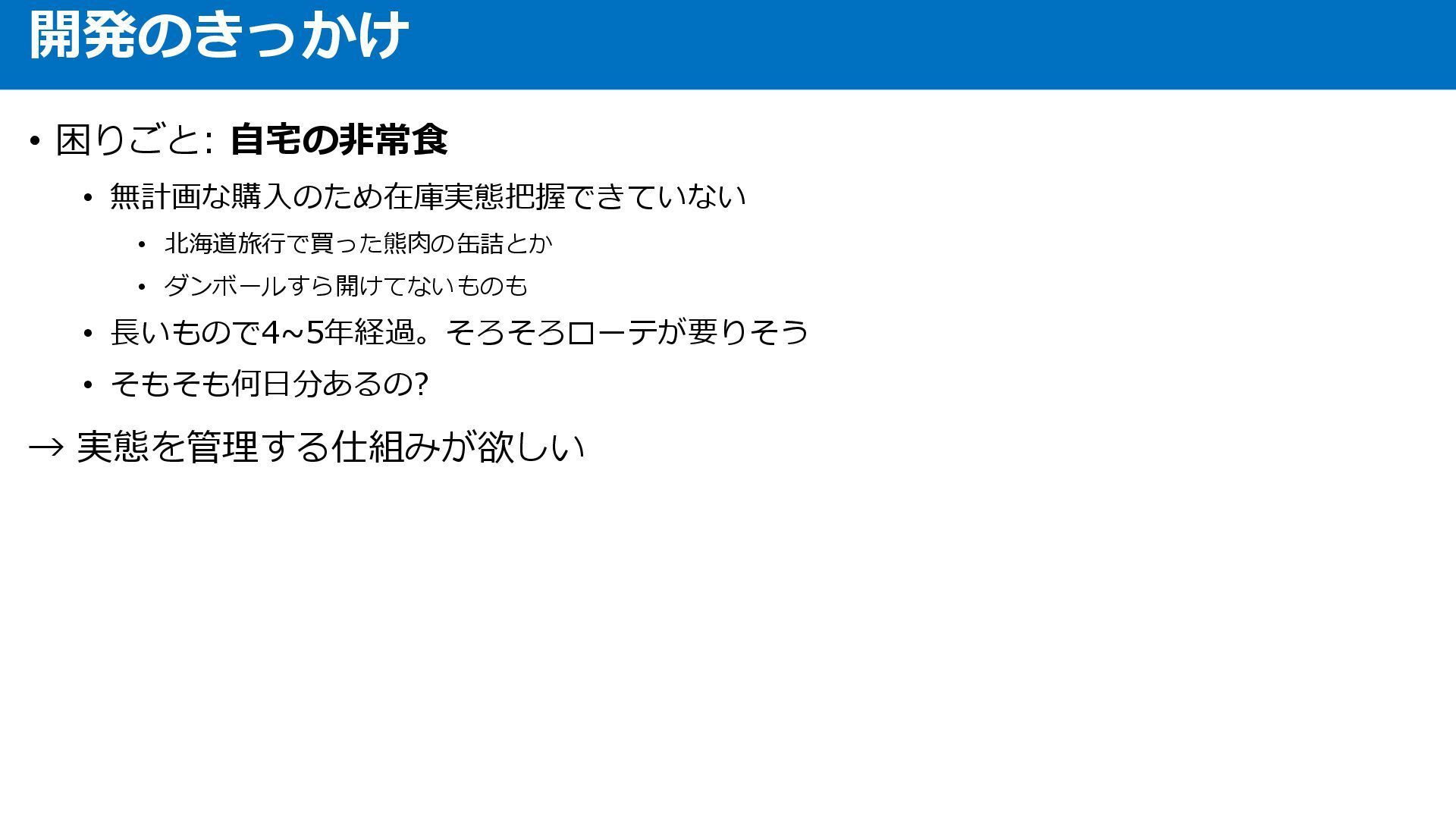 • 困りごと: 自宅の非常食 • 無計画な購入のため在庫実態把握できていない • 北海道旅行で買った熊肉の缶詰とか • ダンボールすら開けてないものも •