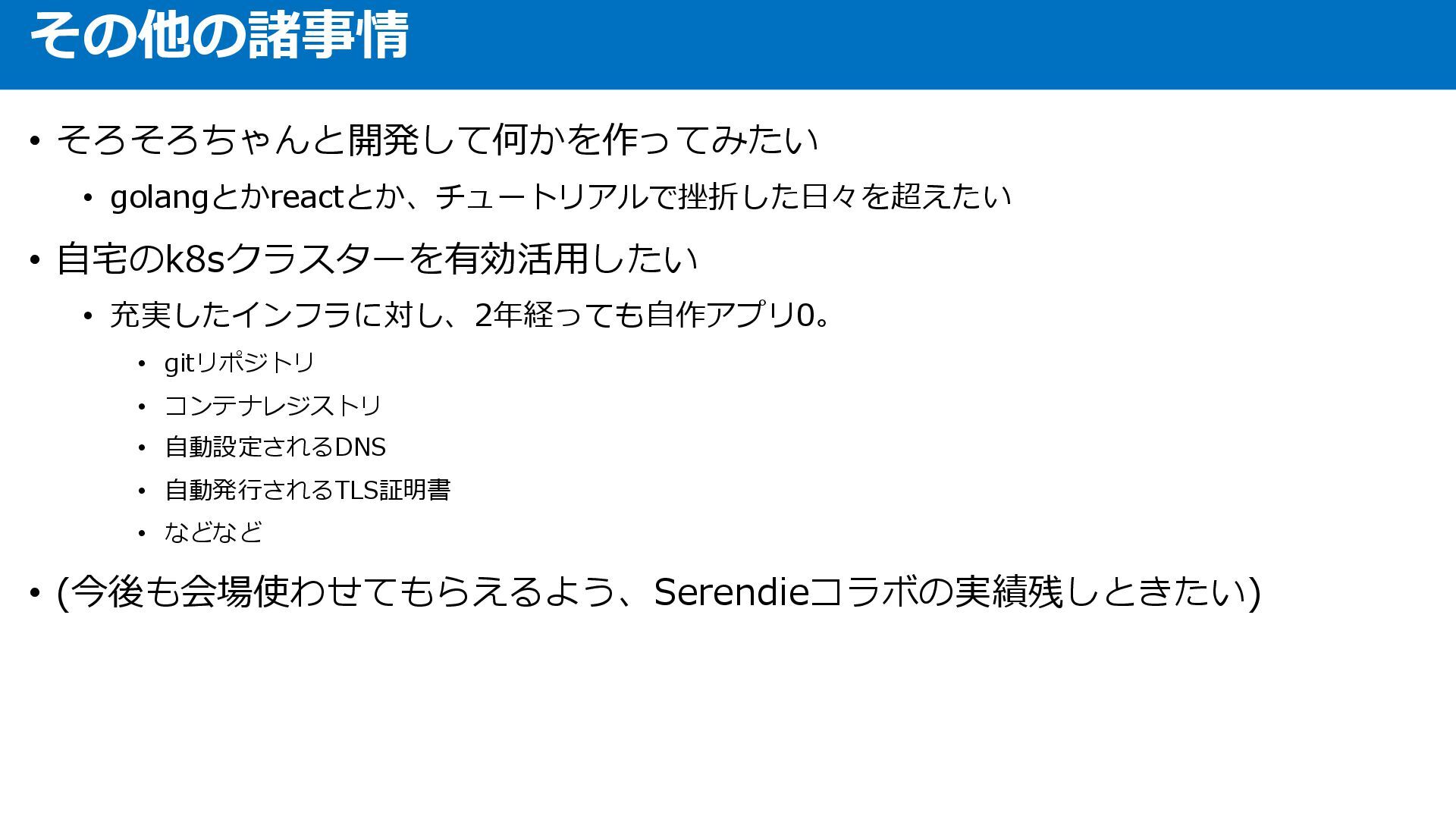 • コンテナレジストリ • 自動設定されるDNS • 自動発行されるTLS証明書 • などなど • (今後も会場使わせてもらえるよう、Serendieコラボの実績残しときたい) その他の諸事情