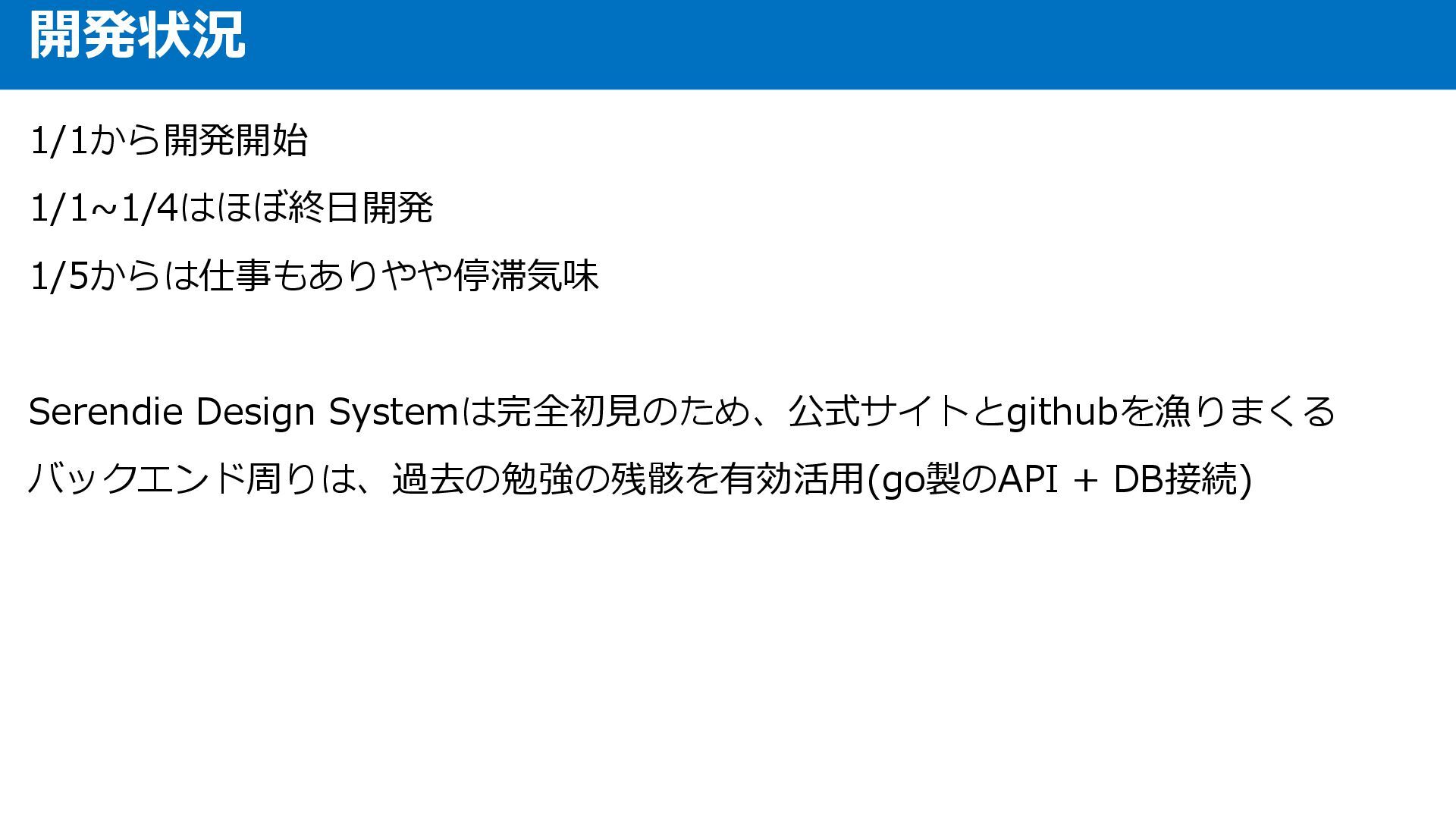 1/1から開発開始 1/1~1/4はほぼ終日開発 1/5からは仕事もありやや停滞気味 Serendie Design Systemは完全初見のため、公式サイトとgithubを漁りまくる バックエンド周りは、過去の勉強の残骸を有効活用(go製のAPI + DB接続) 開発状況