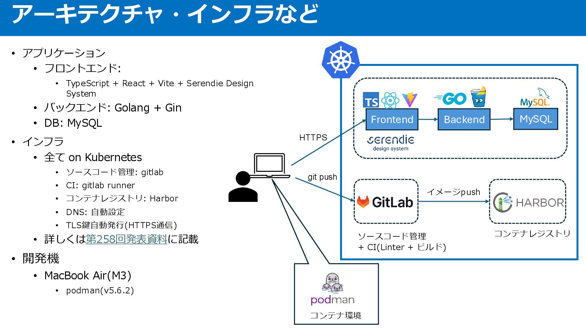 + Serendie Design System • バックエンド: Golang + Gin • DB: MySQL • インフラ • 全て on Kubernetes • ソースコード管理: gitlab • CI: gitlab runner • コンテナレジストリ: Harbor • DNS: 自動設定 • TLS鍵自動発行(HTTPS通信) • 詳しくは第258回発表資料に記載 • 開発機 • MacBook Air(M3) • podman(v5.6.2) アーキテクチャ・インフラなど Frontend Backend MySQL HTTPS イメージpush ソースコード管理 + CI(Linter + ビルド) コンテナレジストリ コンテナ環境 git push