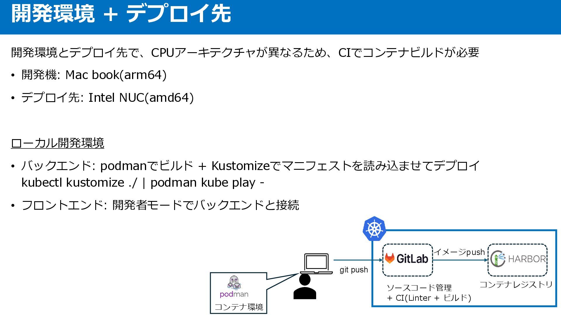 • バックエンド: podmanでビルド + Kustomizeでマニフェストを読み込ませてデプロイ kubectl kustomize ./ | podman kube play - • フロントエンド: 開発者モードでバックエンドと接続 開発環境 + デプロイ先 イメージpush ソースコード管理 + CI(Linter + ビルド) コンテナレジストリ コンテナ環境 git push