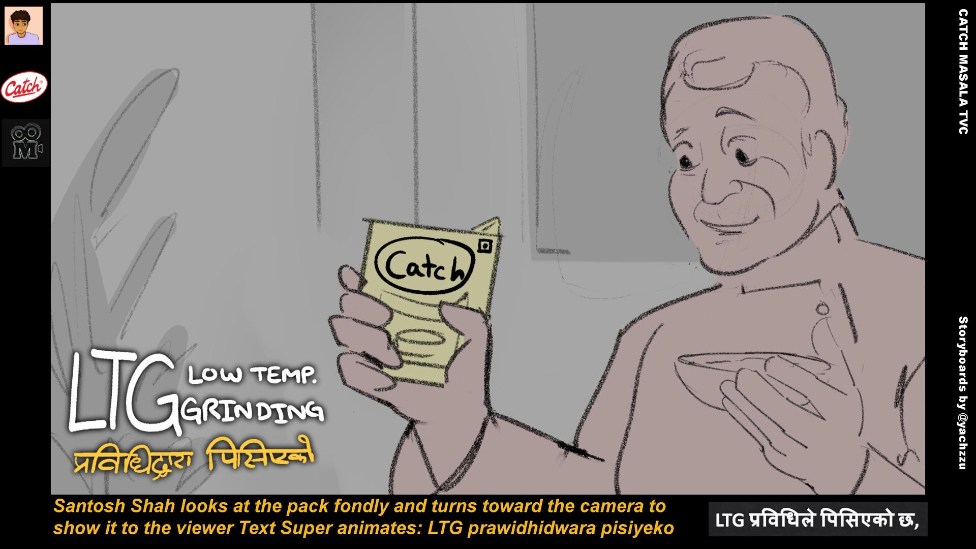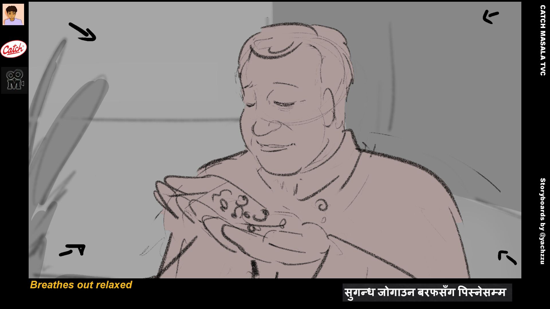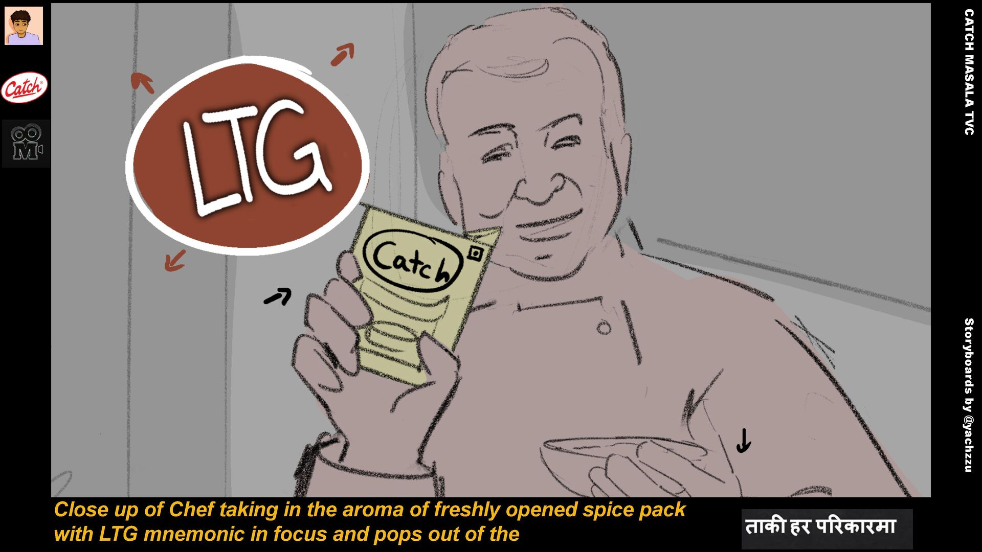 T V C S t o r y b o a r d s b y @ y a c h z z u C l o s e u p o f C h e f t a k i n g i n t h e a r o ma o f f r e s h l y o p e n e d s p i c e p a c k w i t h L T G mn e mo n i c i n f o c u s a n d p o p s o u t o f t h e