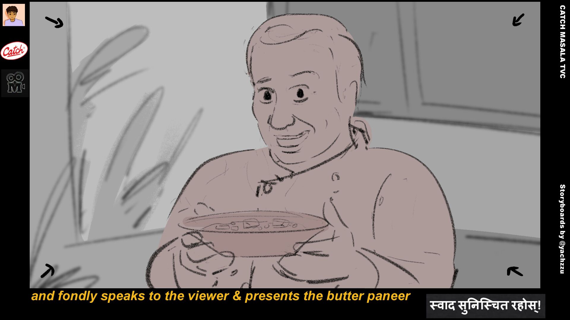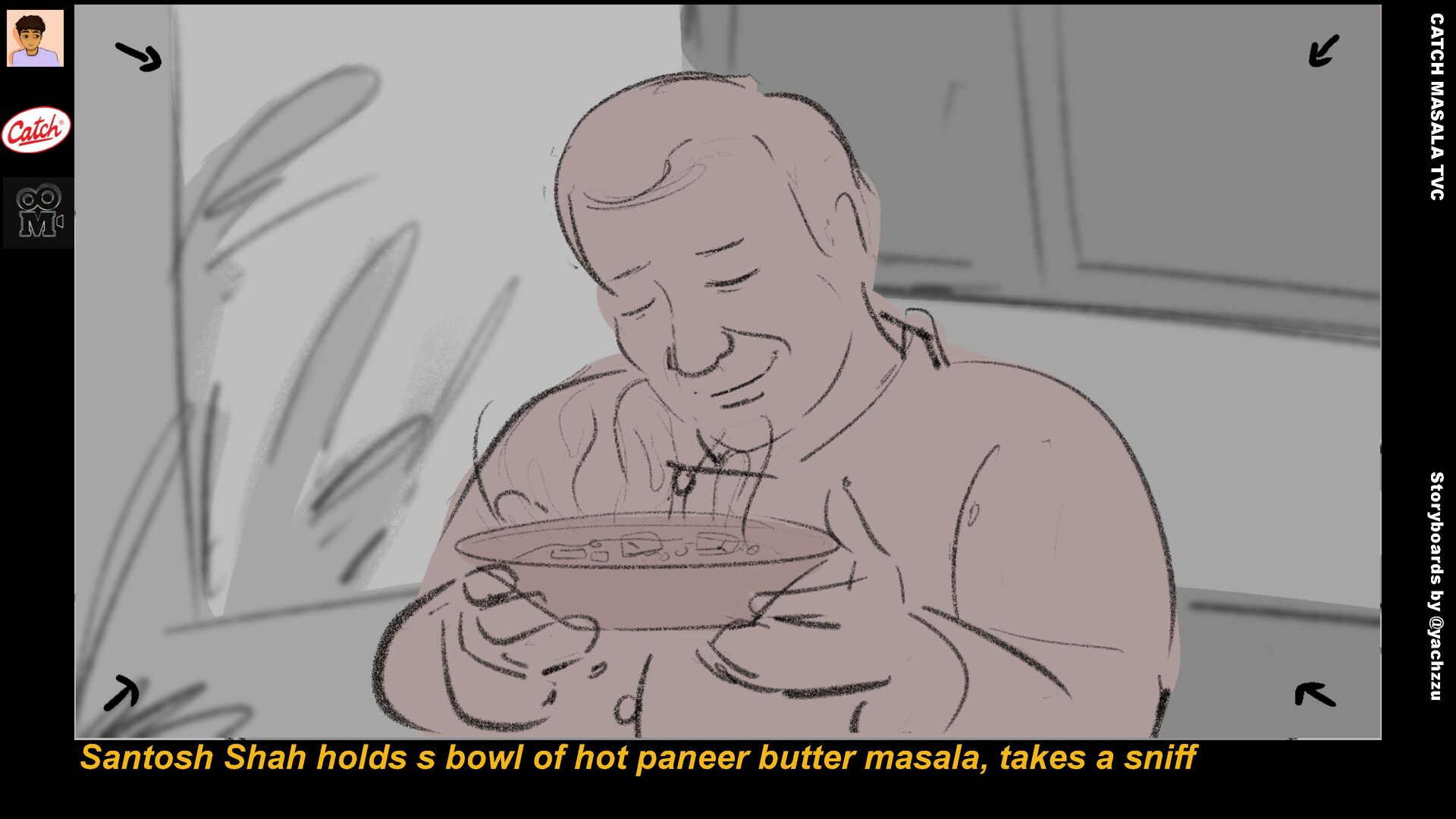 T V C S t o r y b o a r d s b y @ y a c h z z u S a n t o s h S h a h h o l d s s b o w l o f h o t p a n e e r b u t t e r ma s a l a , t a k e s a s n i f f