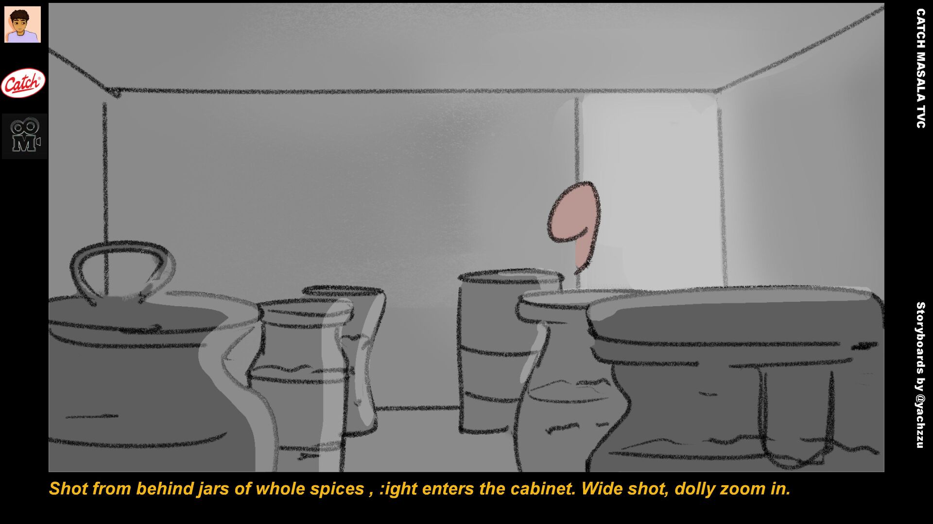 T V C S t o r y b o a r d s b y @ y a c h z z u S h o t f r o m b e h i n d j a r s o f w h o l e s p i c e s , : i g h t e n t e r s t h e c a b i n e t . Wi d e s h o t , d o l l y z o o m i n .