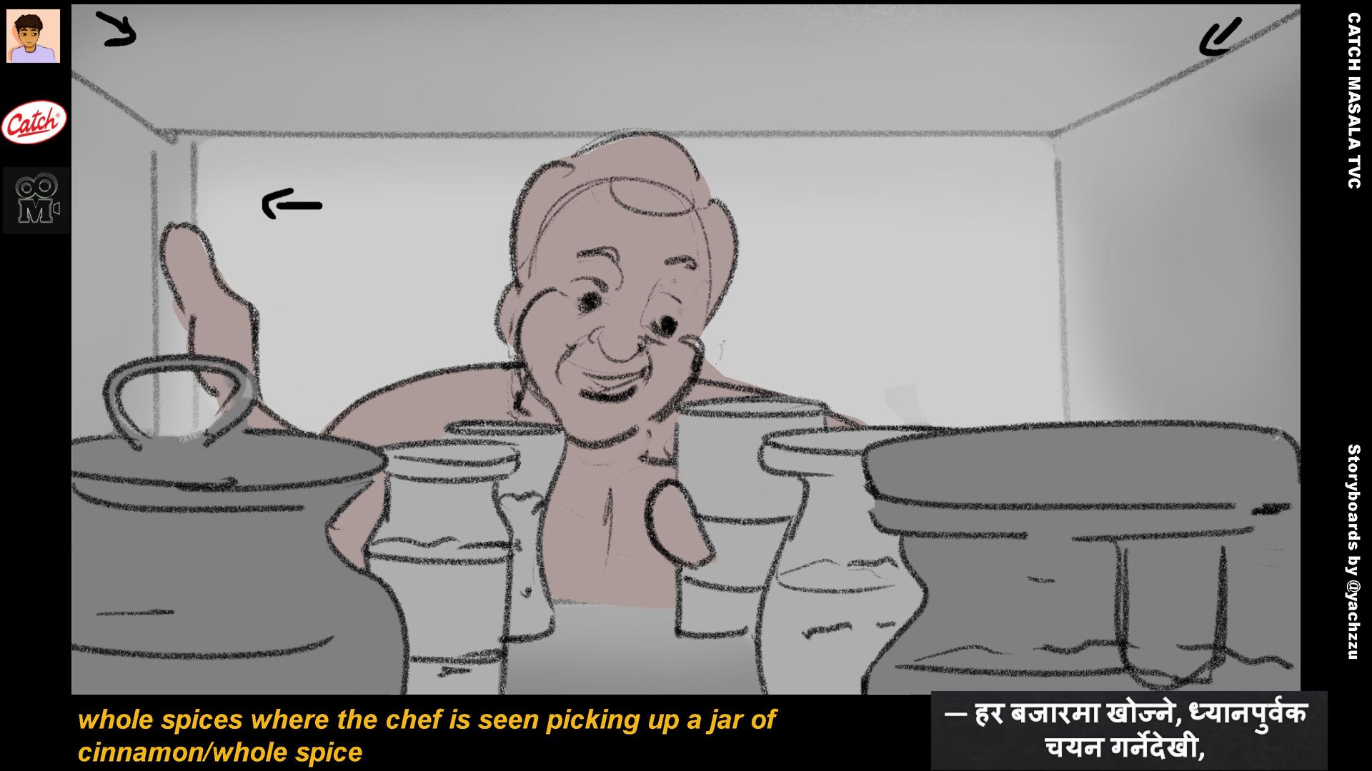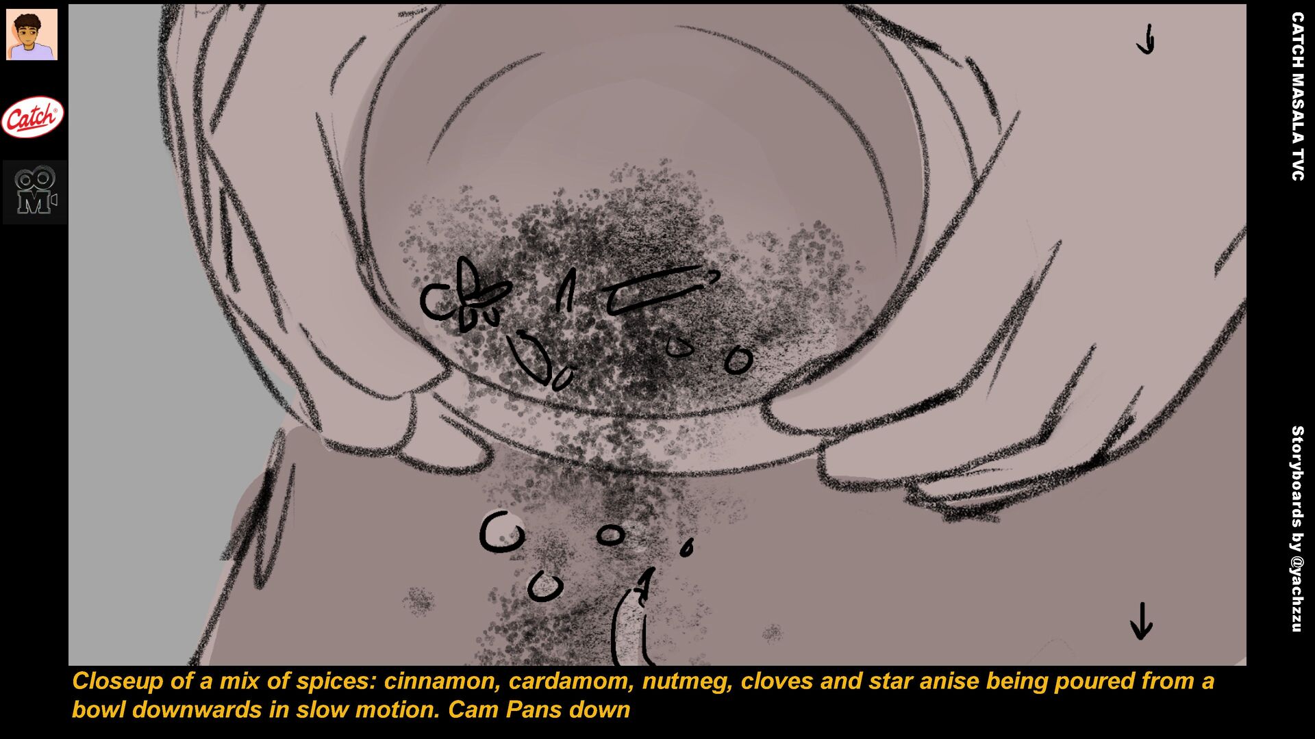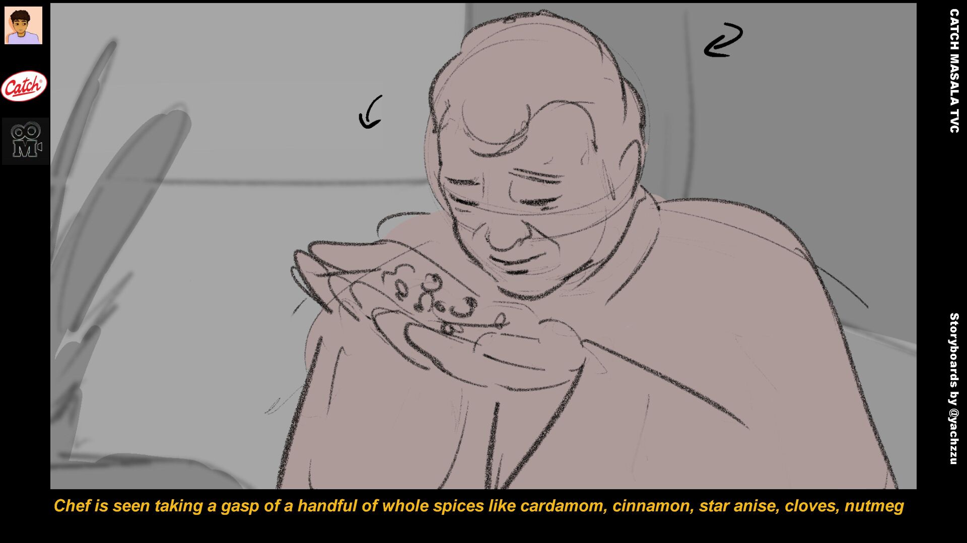T V C S t o r y b o a r d s b y @ y a c h z z u C h e f i s s e e n t a k i n g a g a s p o f a h a n d f u l o f w h o l e s p i c e s l i k e c a r d a mo m, c i n n a mo n , s t a r a n i s e , c l o v e s , n u t me g
