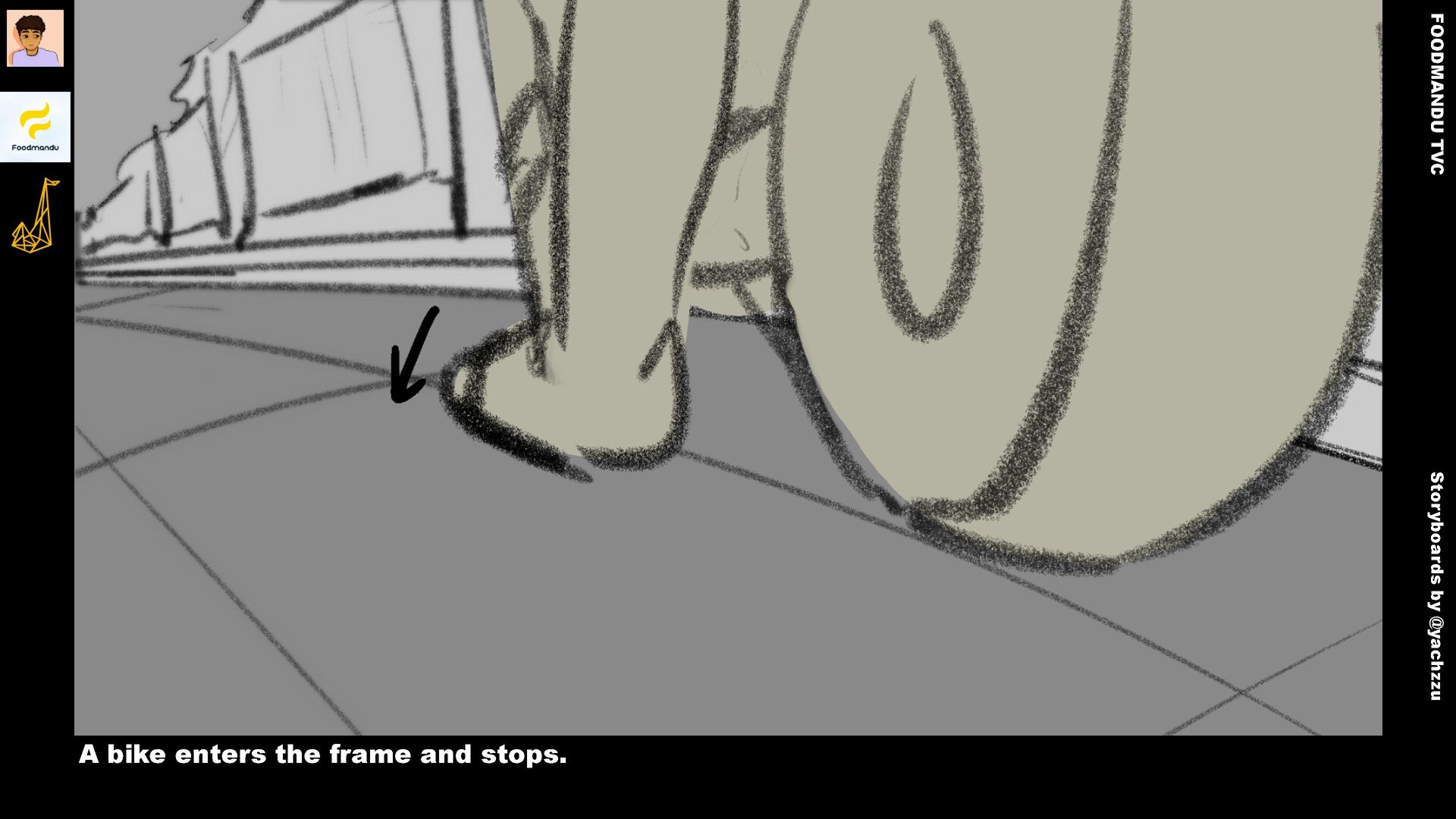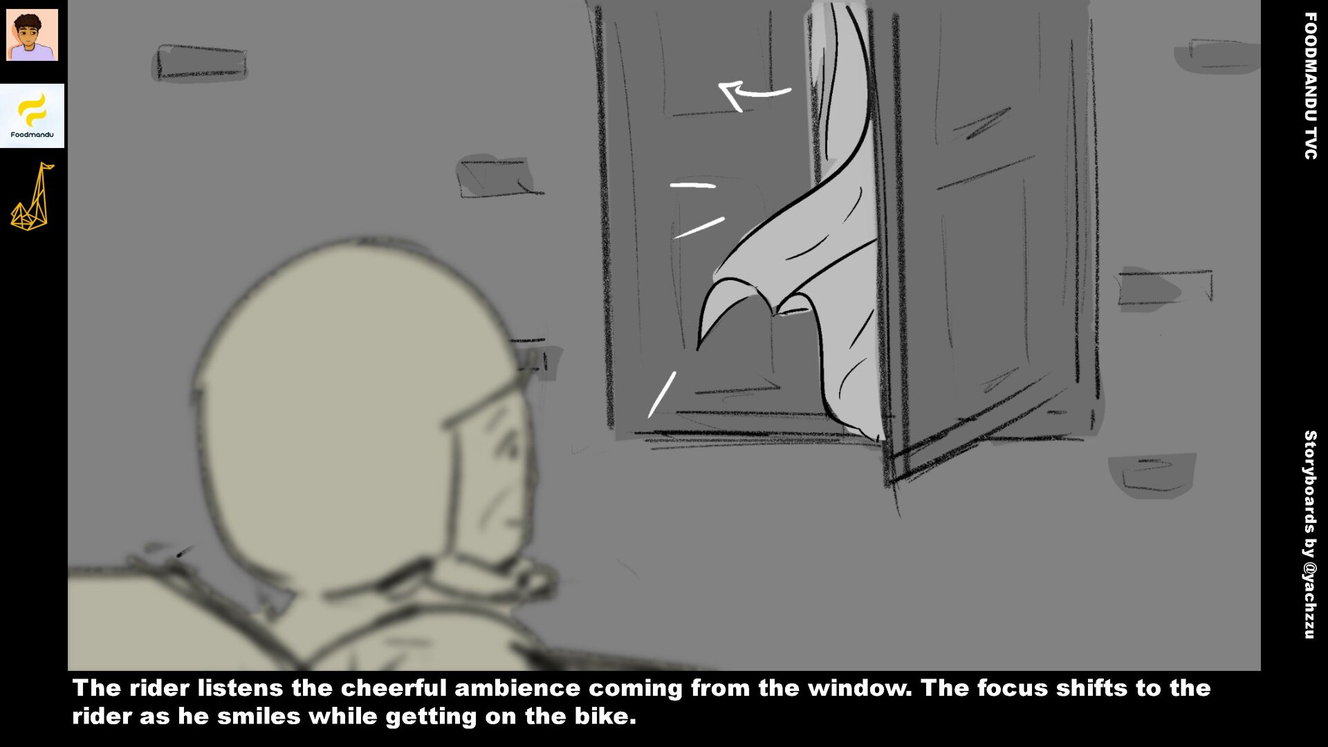 o r y b o a r d s b y @ y a c h z z u T h e r i d e r l i s t e n s t h e c h e e r f u l a mb i e n c e c o mi n g f r o m t h e wi n d o w. T h e f o c u s s h i f t s t o t h e r i d e r a s h e s mi l e s wh i l e g e t t i n g o n t h e b i k e .
