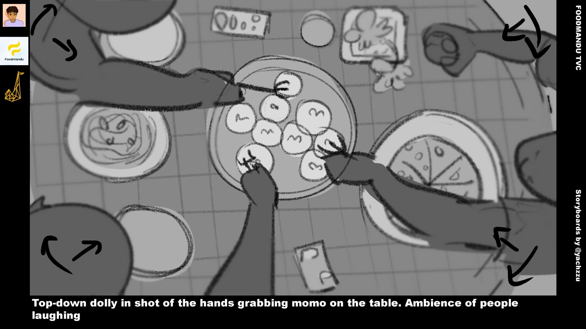 o r y b o a r d s b y @ y a c h z z u T o p - d o wn d o l l y i n s h o t o f t h e h a n d s g r a b b i n g mo mo o n t h e t a b l e . A mb i e n c e o f p e o p l e l a u g h i n g