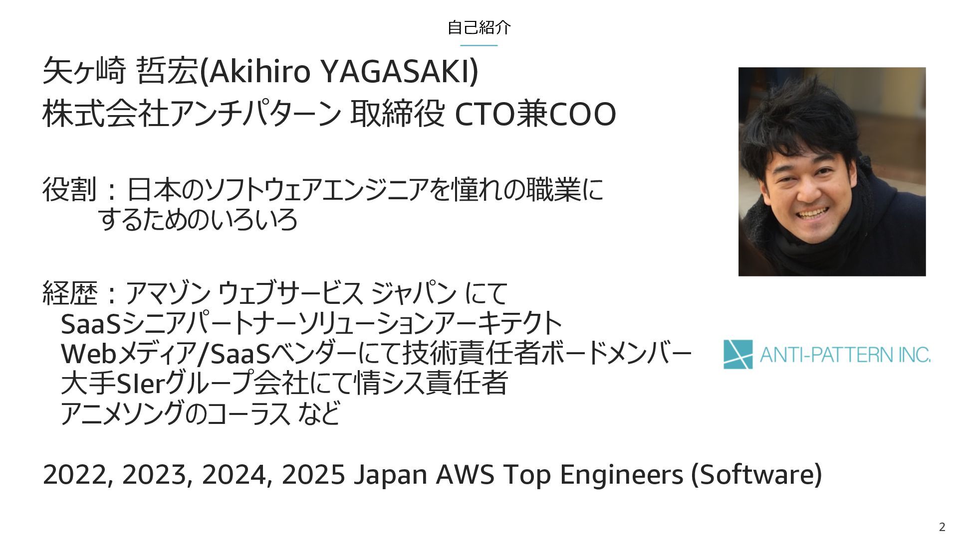 経歴︓アマゾン ウェブサービス ジャパン にて SaaSシニアパートナーソリューションアーキテクト Webメディア/SaaSベンダーにて技術責任者ボードメンバー ⼤⼿SIerグループ会社にて情シス責任者 アニメソングのコーラス など 2022, 2023, 2024, 2025 Japan AWS Top Engineers (Software)