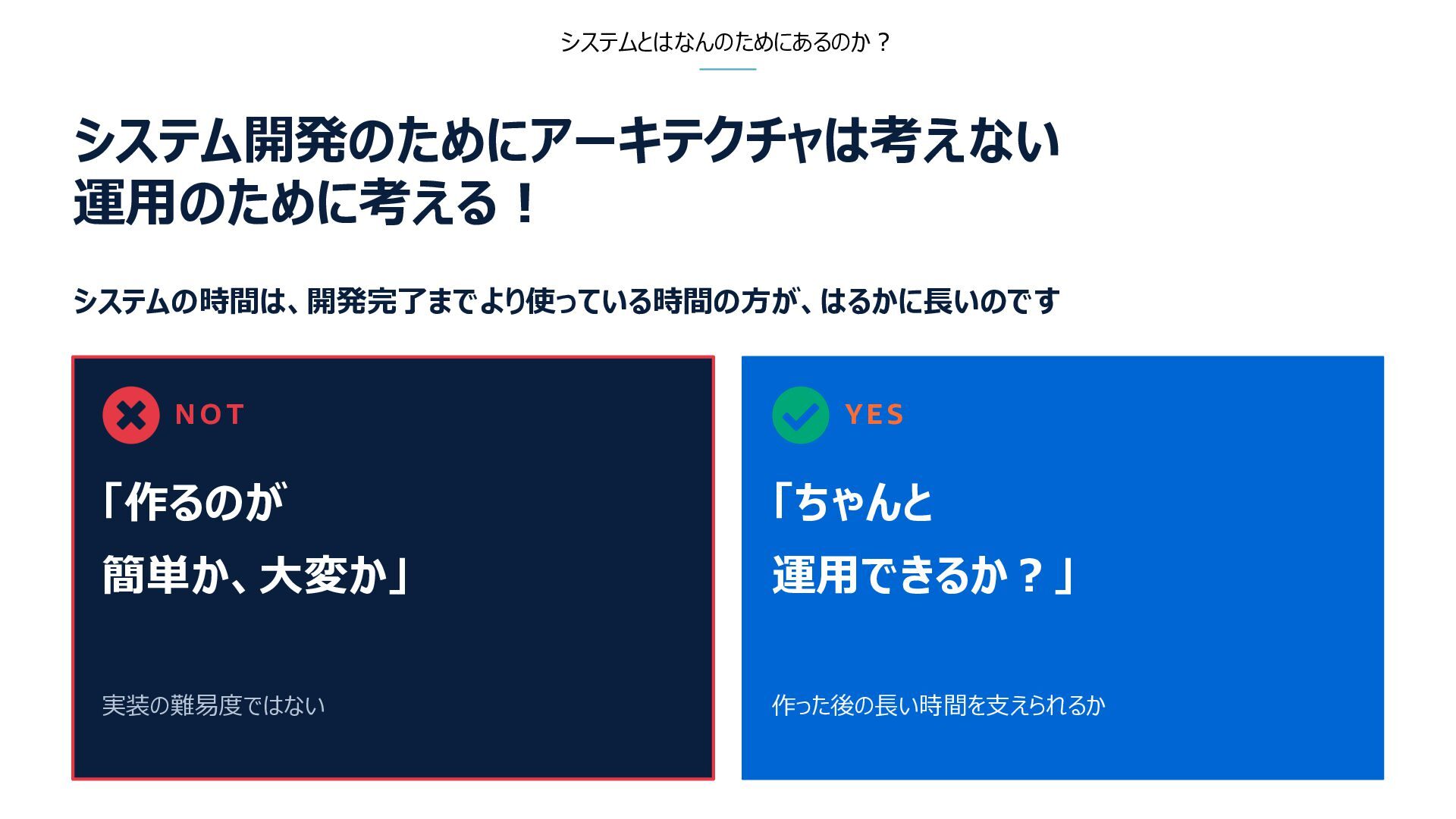システムとはなんのためにあるのか︖ システム開発のためにアーキテクチャは考えない 運⽤のために考える︕ システムの時間は、開発完了までより使っている時間の⽅が、はるかに⻑いのです NOT 「作るのが 簡単か、⼤変か」 実装の難易度ではない YES 「ちゃんと