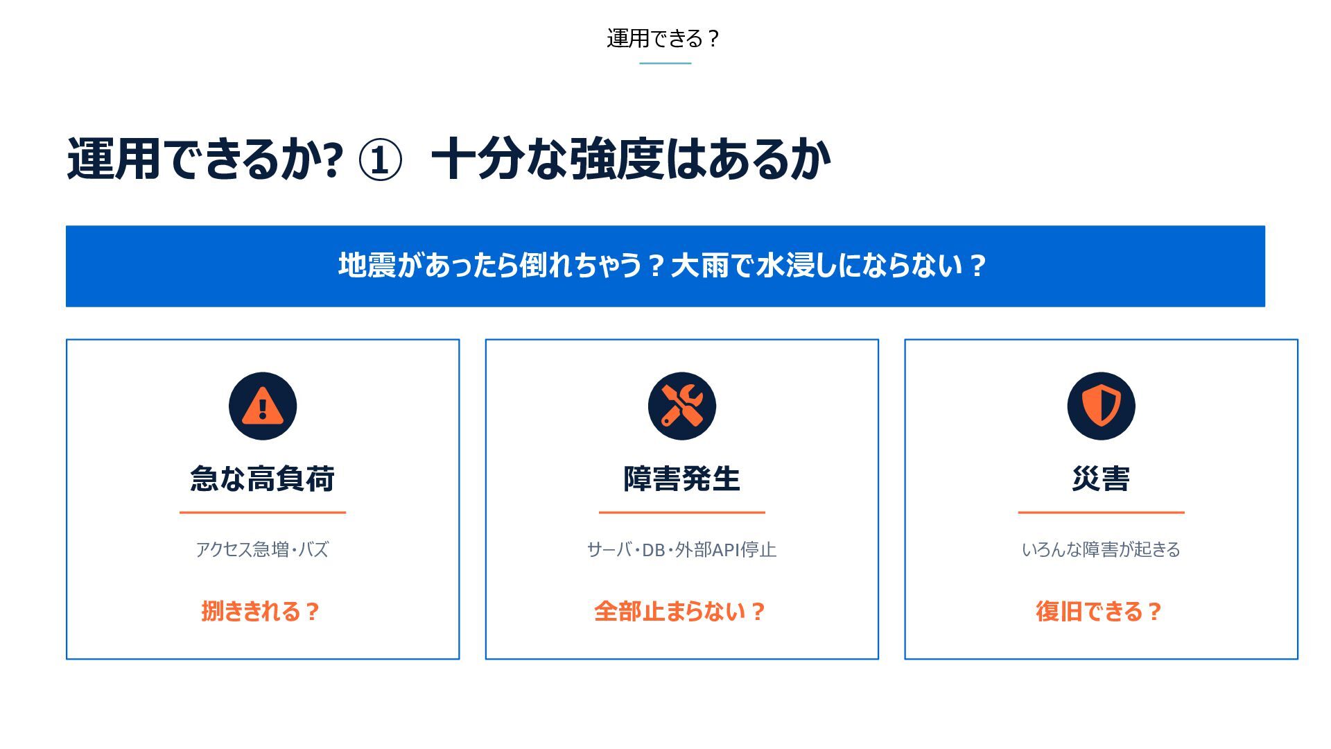 運⽤できる︖ 運⽤できるか? ① ⼗分な強度はあるか 地震があったら倒れちゃう︖⼤⾬で⽔浸しにならない︖ 急な⾼負荷 アクセス急増・バズ 捌ききれる︖ 障害発⽣ サーバ・DB・外部API停⽌