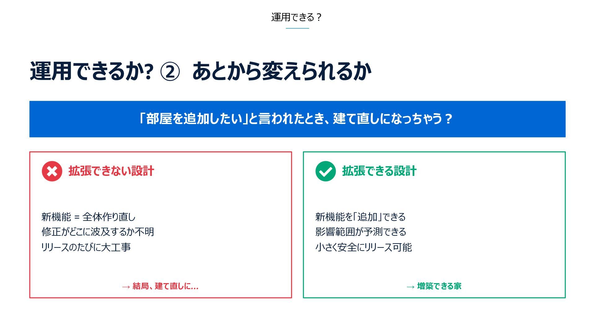 運⽤できる︖ 運⽤できるか? ② あとから変えられるか 「部屋を追加したい」と⾔われたとき、建て直しになっちゃう︖ 拡張できない設計 新機能 = 全体作り直し 修正がどこに波及するか不明