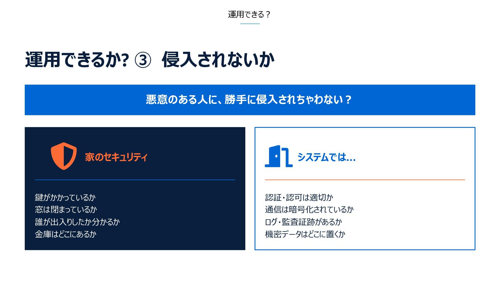 運⽤できる︖ 運⽤できるか? ③ 侵⼊されないか 悪意のある⼈に、勝⼿に侵⼊されちゃわない︖ 家のセキュリティ 鍵がかかっているか 窓は閉まっているか 誰が出⼊りしたか分かるか ⾦庫はどこにあるか