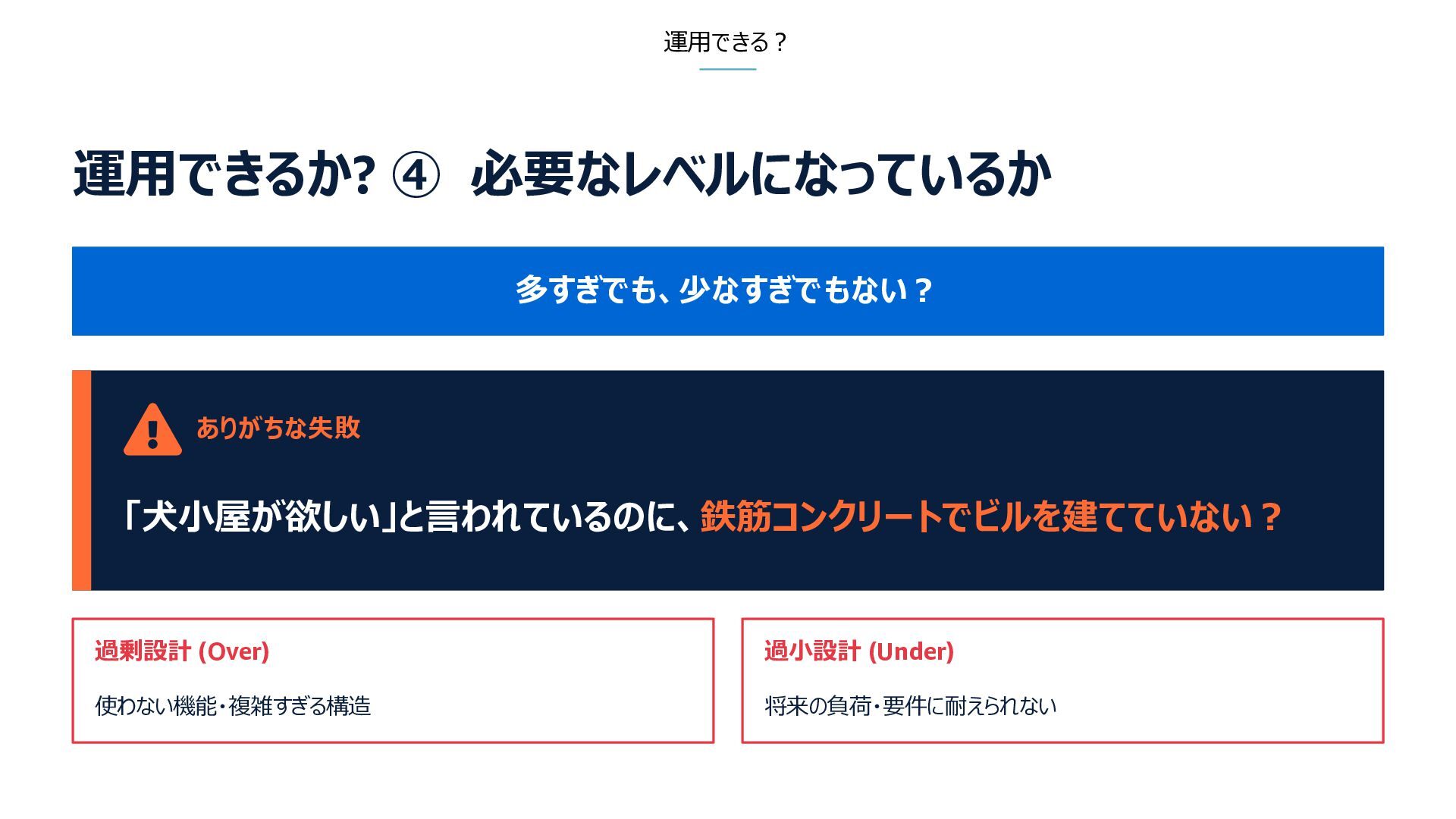 運⽤できる︖ 運⽤できるか? ④ 必要なレベルになっているか 多すぎでも、少なすぎでもない︖ ありがちな失敗 「⽝⼩屋が欲しい」と⾔われているのに、鉄筋コンクリートでビルを建てていない︖ 過剰設計 (Over) 使わない機能・複雑すぎる構造