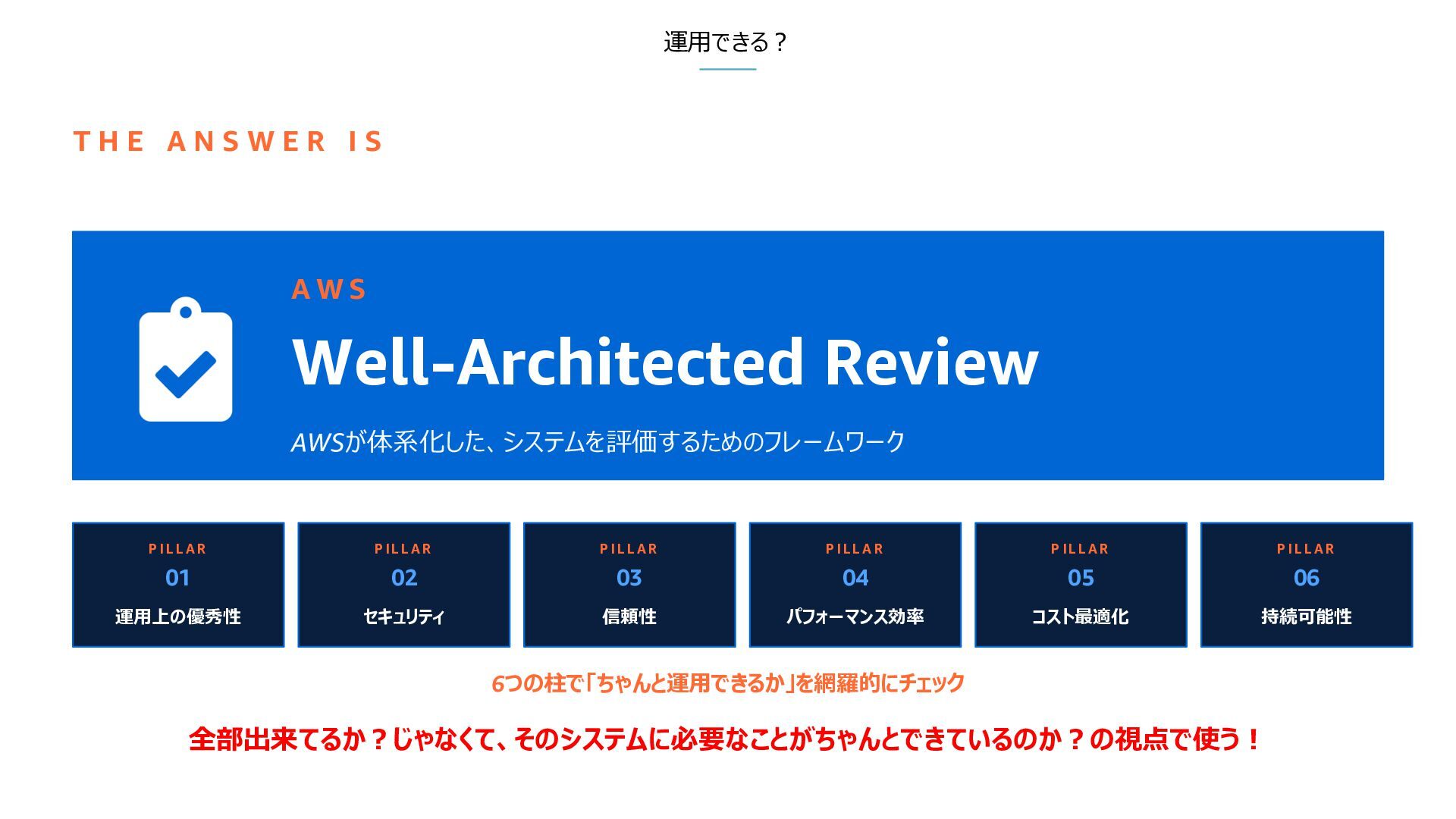 L L A R 01 運⽤上の優秀性 P I L L A R 02 セキュリティ P I L L A R 03 信頼性 P I L L A R 04 パフォーマンス効率 P I L L A R 05 コスト最適化 P I L L A R 06 持続可能性 6つの柱で「ちゃんと運⽤できるか」を網羅的にチェック 全部出来てるか︖じゃなくて、そのシステムに必要なことがちゃんとできているのか︖の視点で使う︕ T H E A N S W E R I S