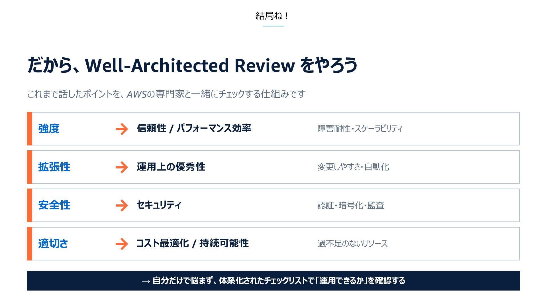 結局ね︕ だから、Well-Architected Review をやろう これまで話したポイントを、AWSの専⾨家と⼀緒にチェックする仕組みです 強度 信頼性 / パフォーマンス効率 障害耐性・スケーラビリティ