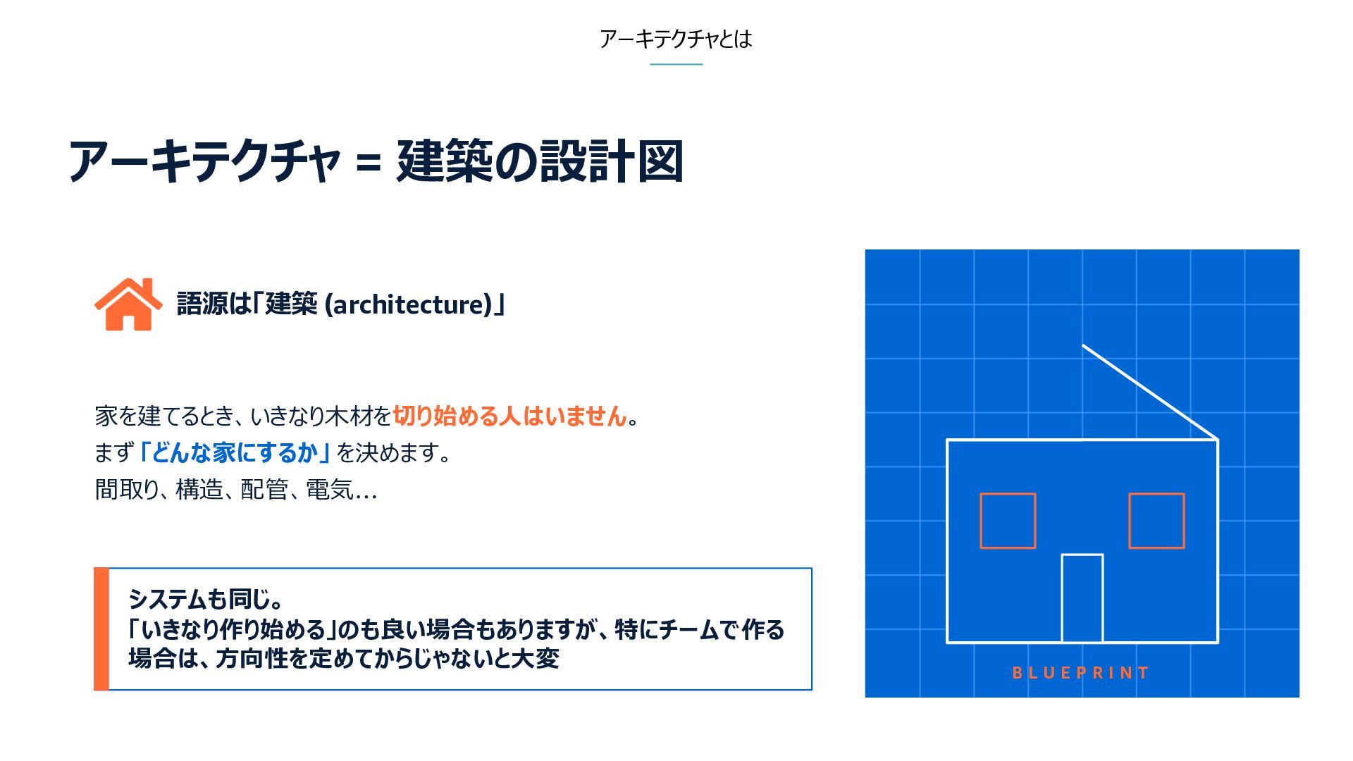アーキテクチャとは アーキテクチャ = 建築の設計図 語源は「建築 (architecture)」 家を建てるとき、いきなり⽊材を切り始める⼈はいません。 まず 「どんな家にするか」 を決めます。