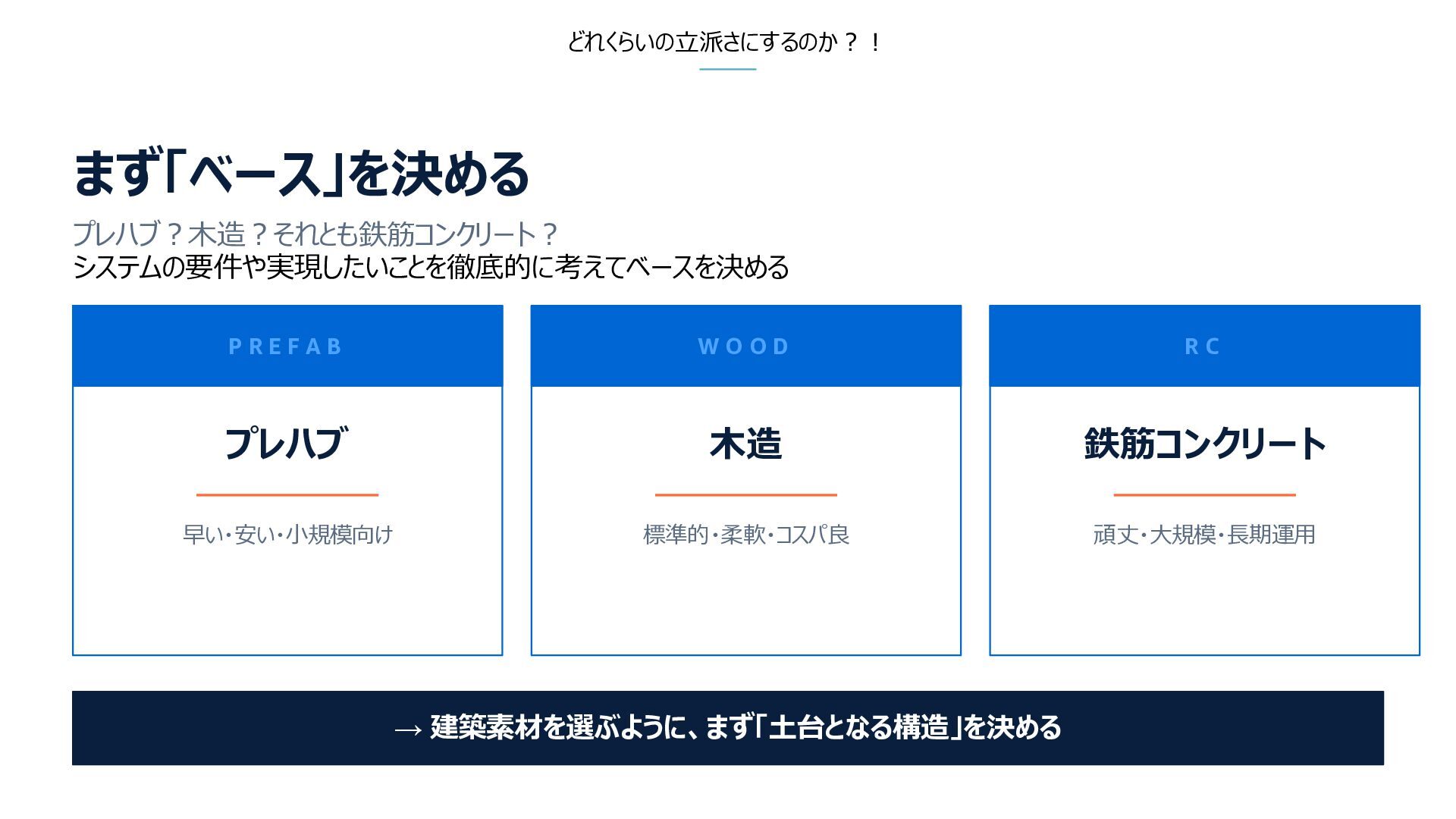 どれくらいの⽴派さにするのか︖︕ まず「ベース」を決める プレハブ︖⽊造︖それとも鉄筋コンクリート︖ システムの要件や実現したいことを徹底的に考えてベースを決める P R E F A B