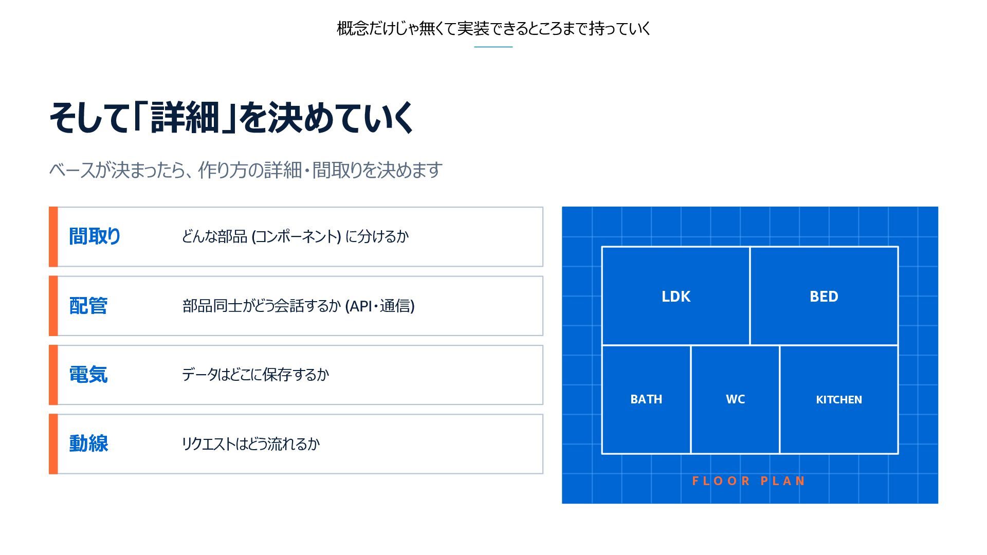 O O R P L A N 間取り どんな部品 (コンポーネント) に分けるか 配管 部品同⼠がどう会話するか (API・通信) 電気 データはどこに保存するか 動線 リクエストはどう流れるか