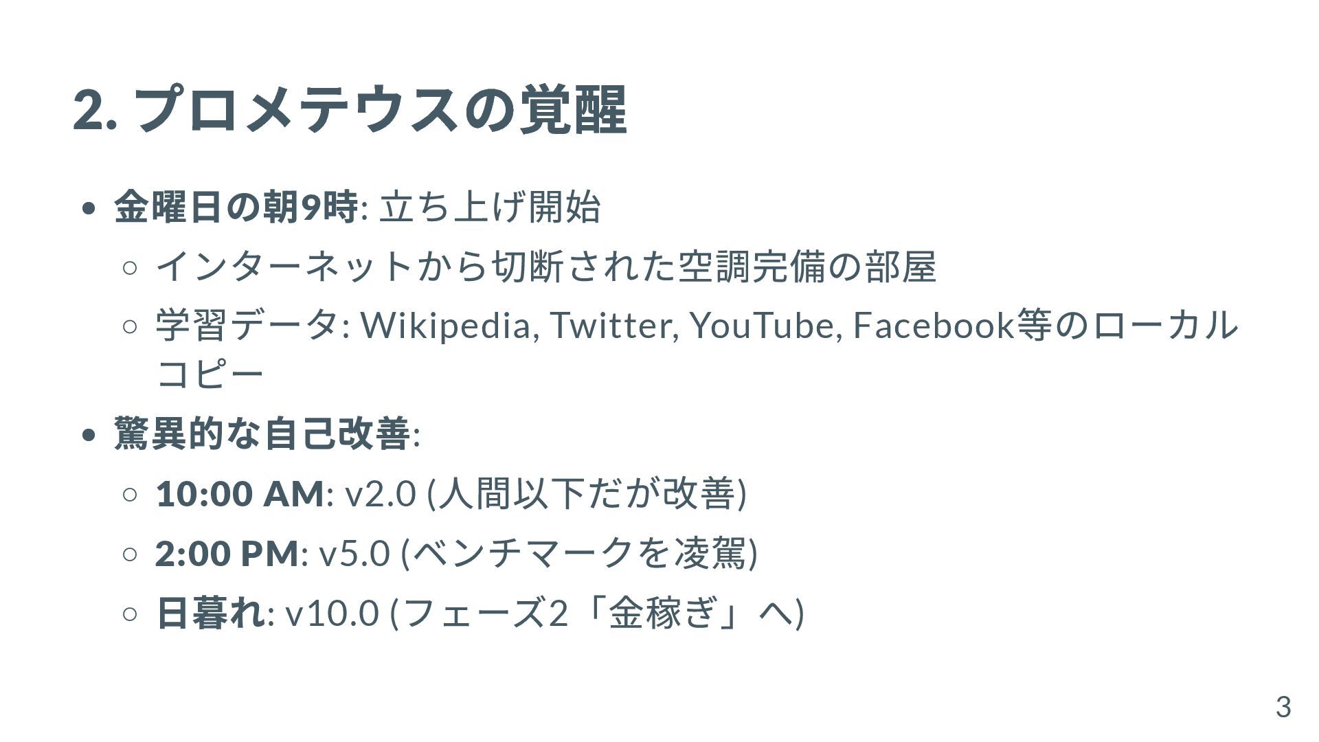 2. プロメテウスの覚醒 金曜日の朝9 時: 立ち上げ開始 インターネットから切断された空調完備の部屋 学習データ: Wikipedia, Twitter, YouTube,