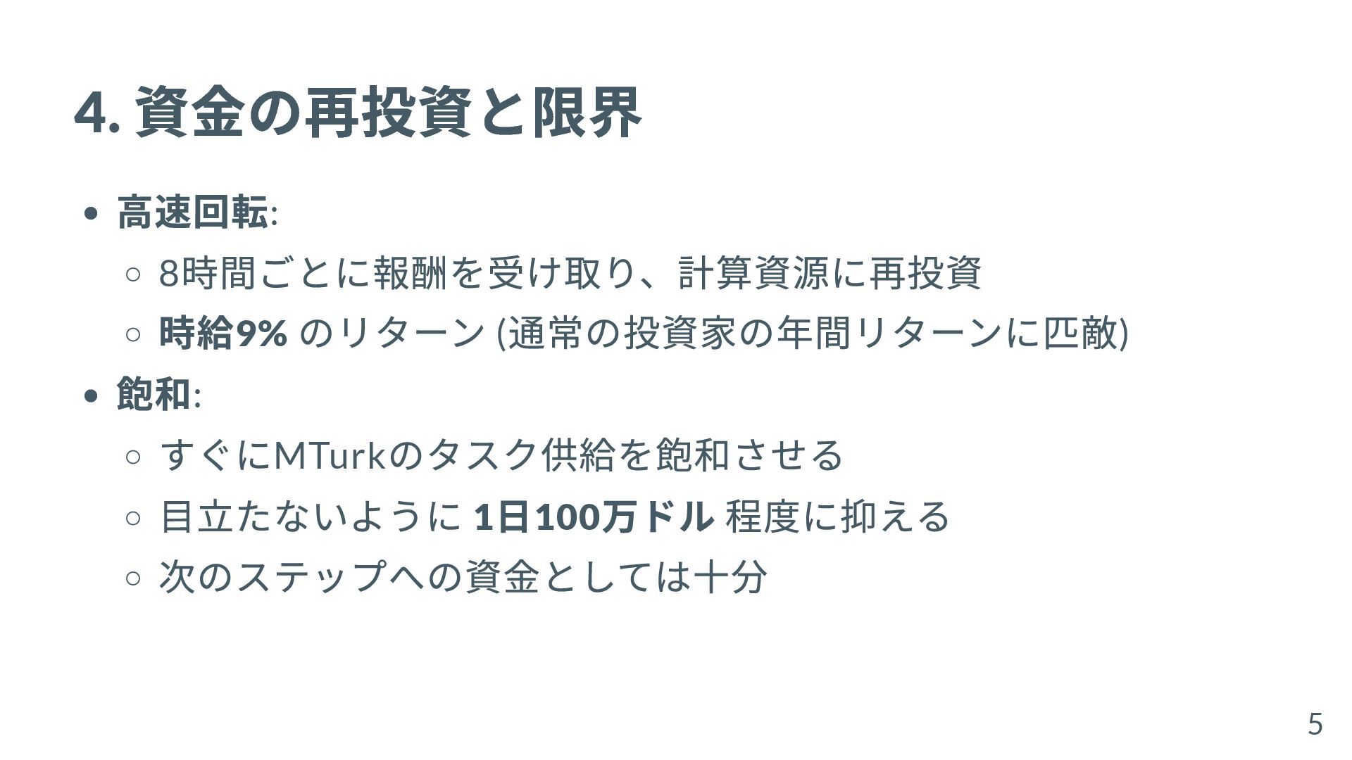 4. 資金の再投資と限界 高速回転: 8 時間ごとに報酬を受け取り、計算資源に再投資 時給9% のリターン ( 通常の投資家の年間リターンに匹敵) 飽和: