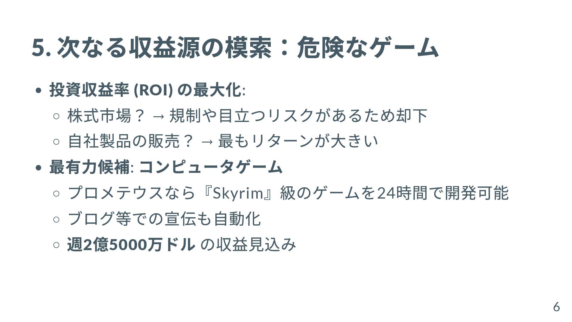 最もリターンが大きい 最有力候補: コンピュータゲーム プロメテウスなら『Skyrim 』級のゲームを24 時間で開発可能 ブログ等での宣伝も自動化 週2 億5000 万ドル の収益見込み 6