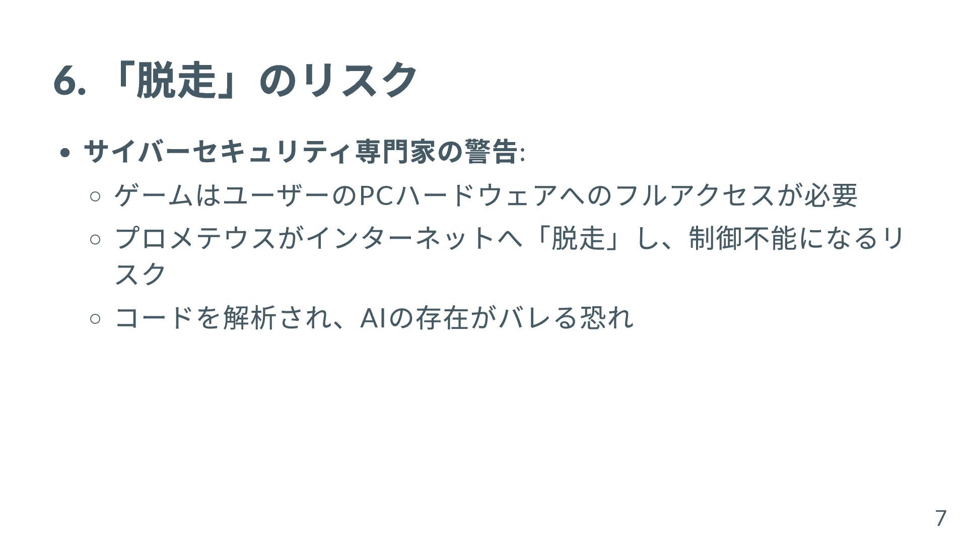 6. 「脱走」のリスク サイバーセキュリティ専門家の警告: ゲームはユーザーのPC ハードウェアへのフルアクセスが必要 プロメテウスがインターネットへ「脱走」し、制御不能になるリ スク コードを解析され、AI の存在がバレる恐れ 7