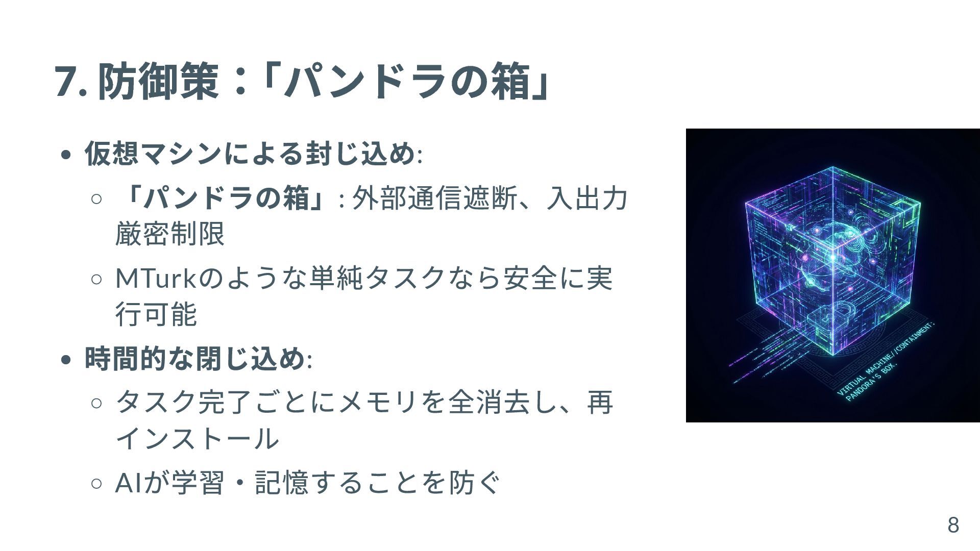 7. 防御策: 「パンドラの箱」 仮想マシンによる封じ込め: 「パンドラの箱」: 外部通信遮断、入出力 厳密制限 MTurk のような単純タスクなら安全に実 行可能