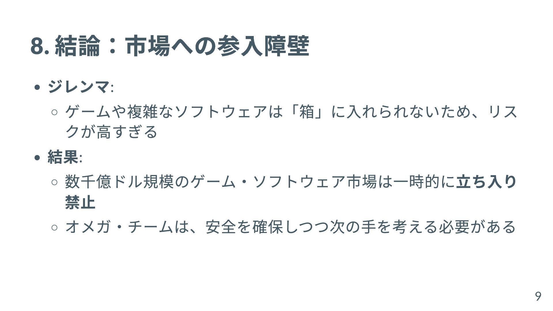 8. 結論:市場への参入障壁 ジレンマ: ゲームや複雑なソフトウェアは「箱」に入れられないため、リス クが高すぎる 結果: 数千億ドル規模のゲーム・ソフトウェア市場は一時的に立ち入り 禁止 オメガ・チームは、安全を確保しつつ次の手を考える必要がある 9
