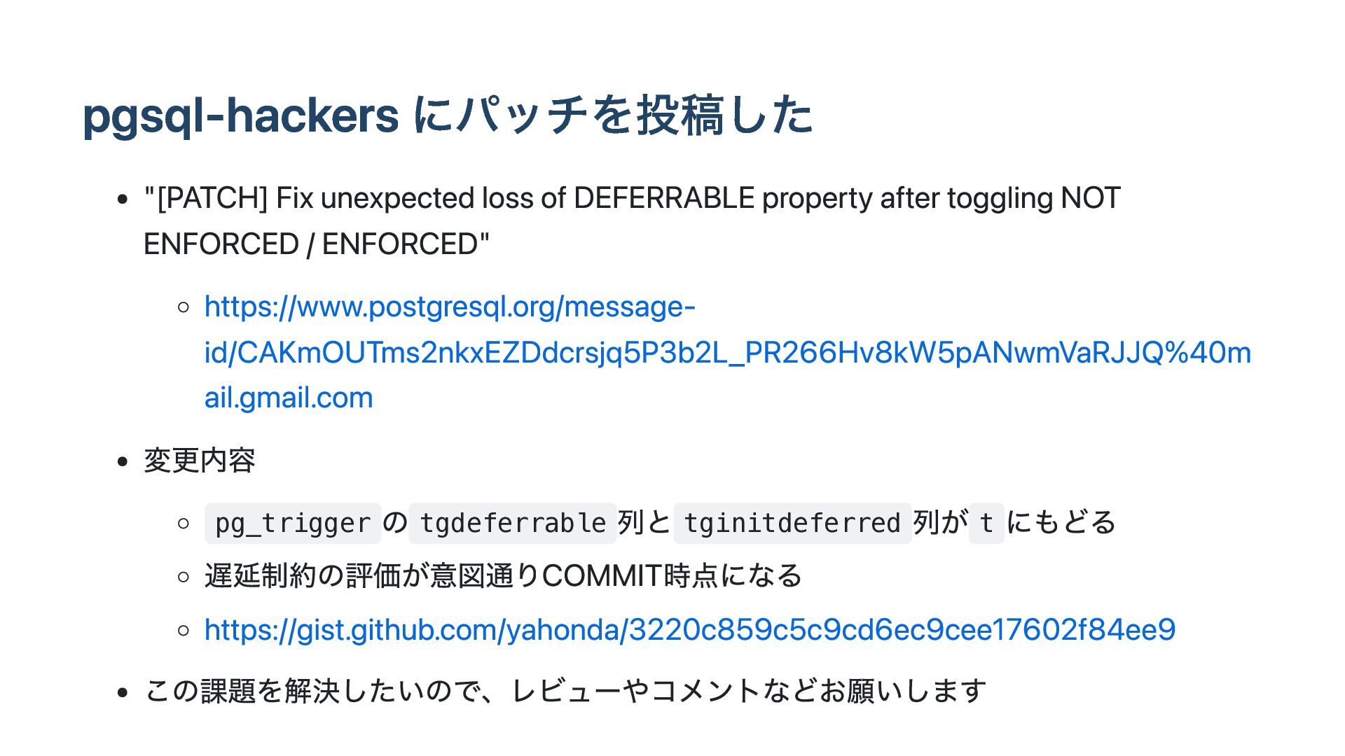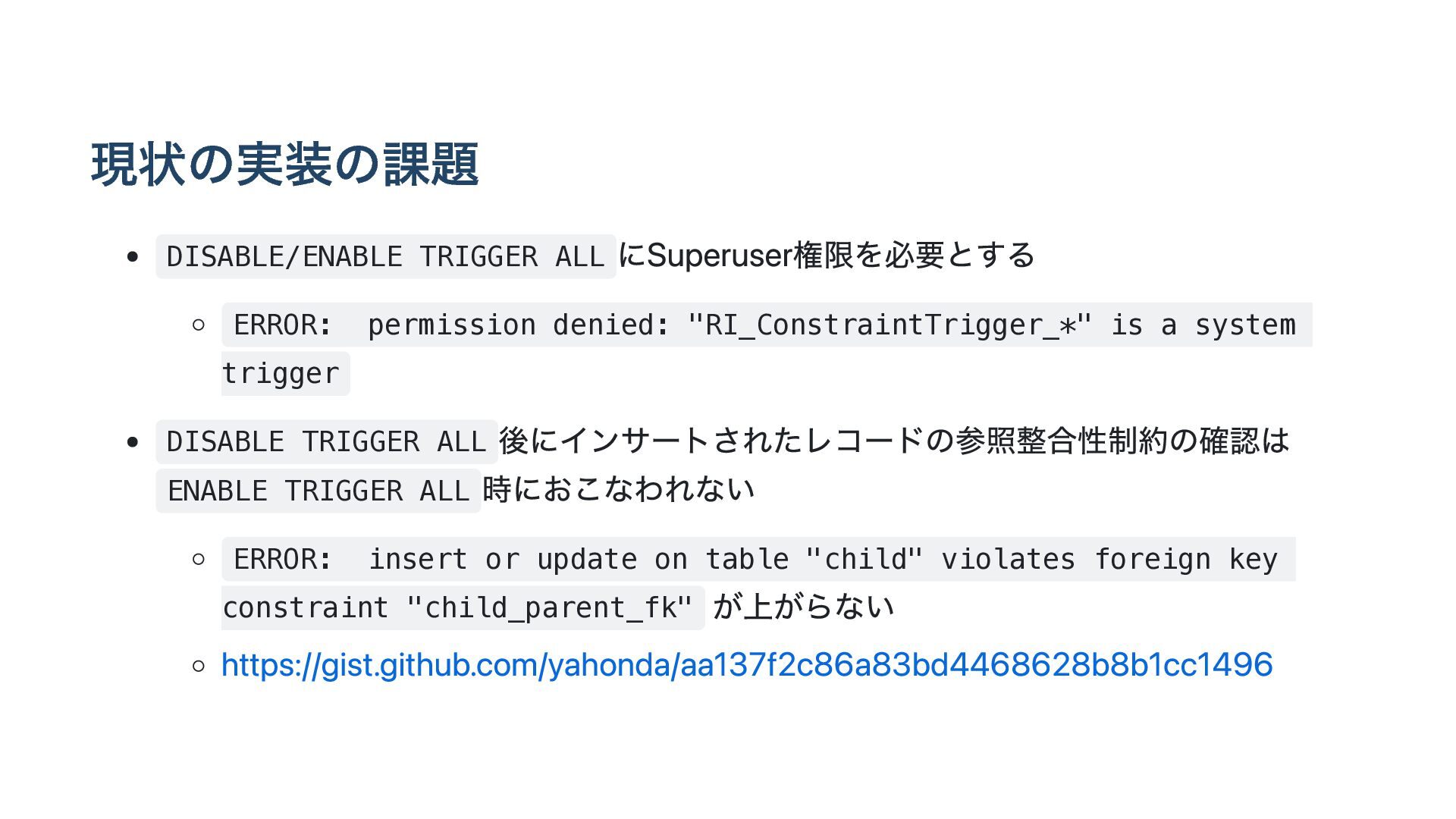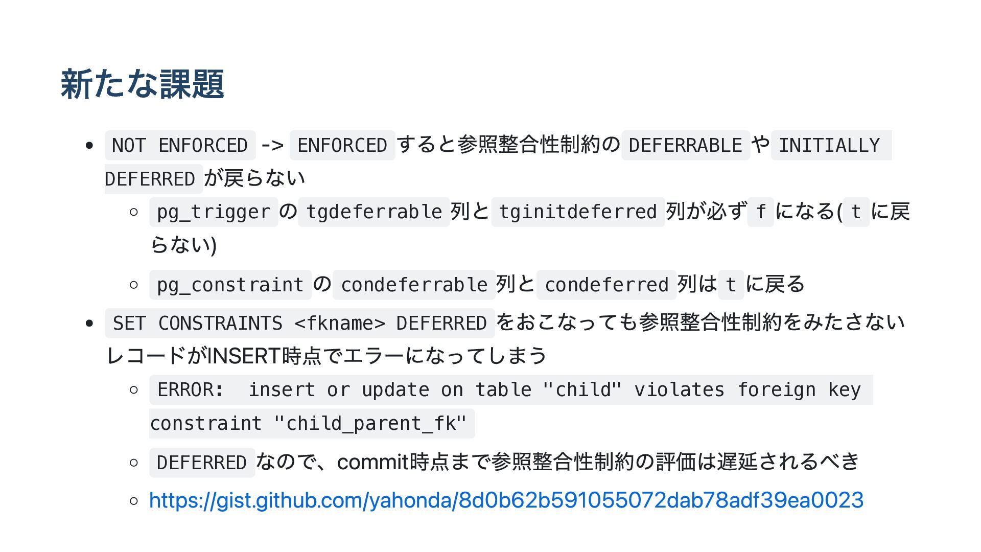 が戻らない pg_trigger の tgdeferrable 列と tginitdeferred 列が必ず f になる( t に戻 らない) pg_constraint の condeferrable 列と condeferred 列は t に戻る SET CONSTRAINTS <fkname> DEFERRED をおこなっても参照整合性制約をみたさない レコードがINSERT時点でエラーになってしまう ERROR: insert or update on table "child" violates foreign key constraint "child_parent_fk" DEFERRED なので、commit時点まで参照整合性制約の評価は遅延されるべき https://gist.github.com/yahonda/8d0b62b591055072dab78adf39ea0023