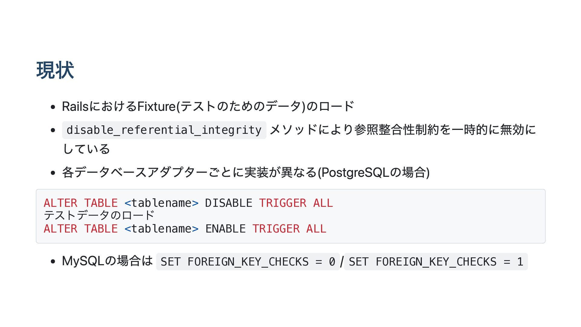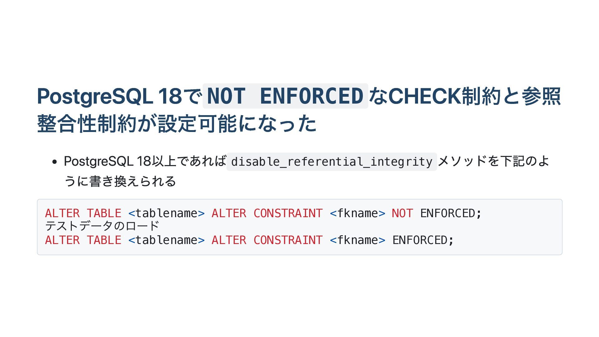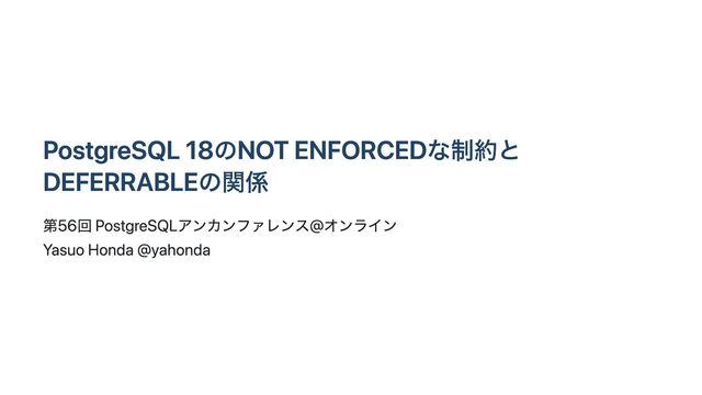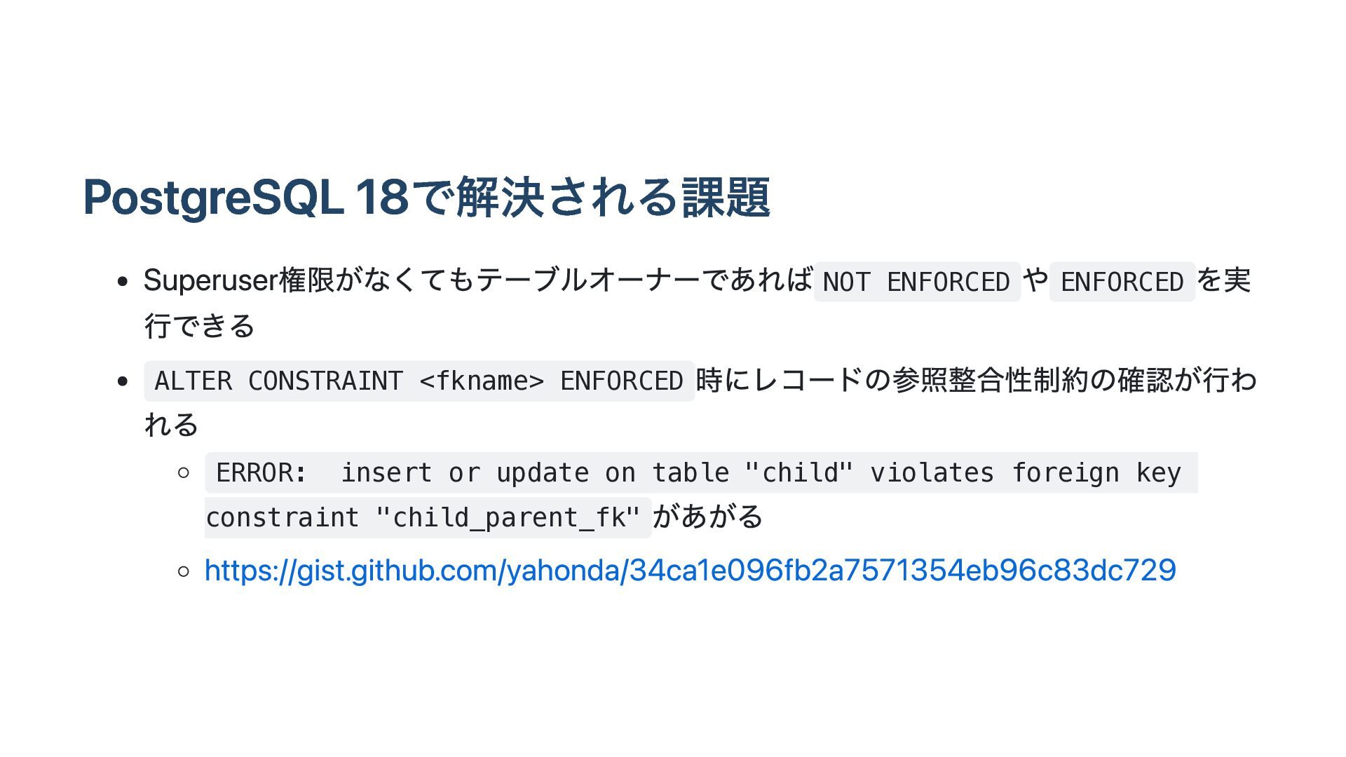が戻らない pg_trigger の tgdeferrable 列と tginitdeferred 列が必ず f になる( t に戻 らない) pg_constraint の condeferrable 列と condeferred 列は t に戻る SET CONSTRAINTS <fkname> DEFERRED をおこなっても参照整合性制約をみたさない レコードがINSERT時点でエラーになってしまう ERROR: insert or update on table "child" violates foreign key constraint "child_parent_fk" DEFERRED なので、commit時点まで参照整合性制約の評価は遅延されるべき https://gist.github.com/yahonda/8d0b62b591055072dab78adf39ea0023