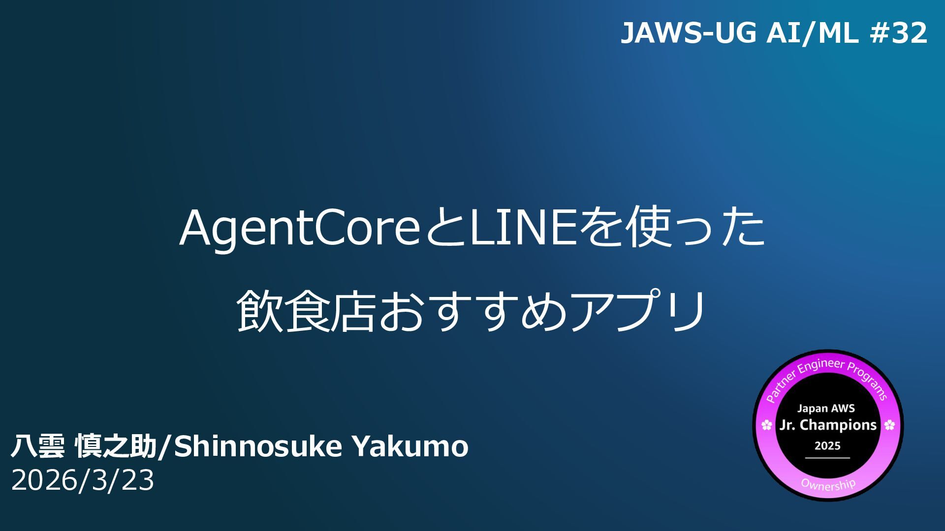 AgentCoreとLINEを使った 飲食店おすすめアプリ 八雲 慎之助/Shinnosuke Yakumo 2026/3/23 JAWS-UG AI/ML #32
