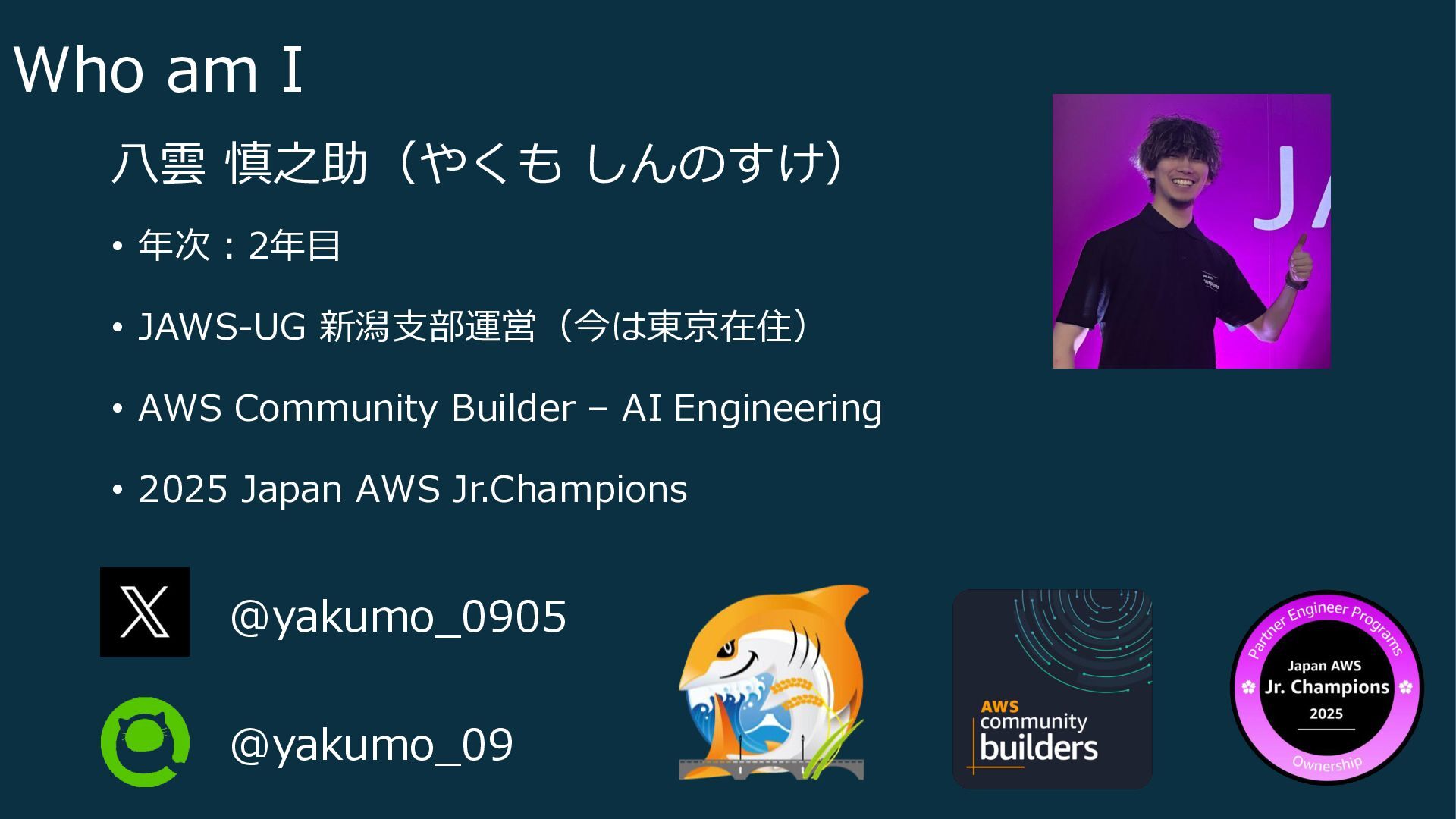Community Builder – AI Engineering • 2025 Japan AWS Jr.Champions Who am I @yakumo_09 @yakumo_0905
