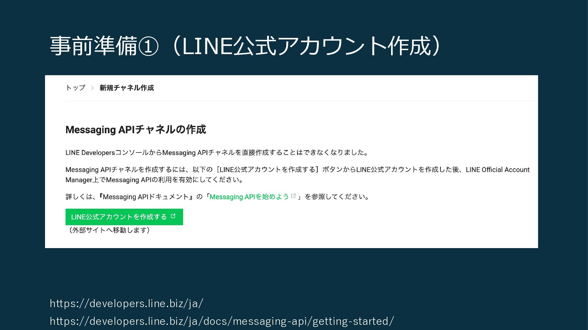 事前準備①(LINE公式アカウント作成) https://developers.line.biz/ja/ https://developers.line.biz/ja/docs/messaging-api/getting-started/