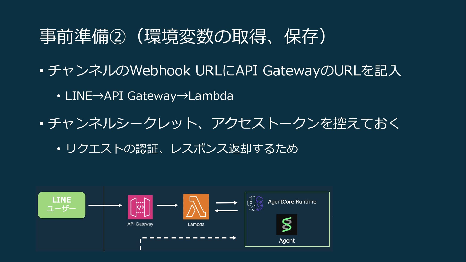 事前準備②(環境変数の取得、保存) • チャンネルのWebhook URLにAPI GatewayのURLを記入 • LINE→API Gateway→Lambda • チャンネルシークレット、アクセストークンを控えておく