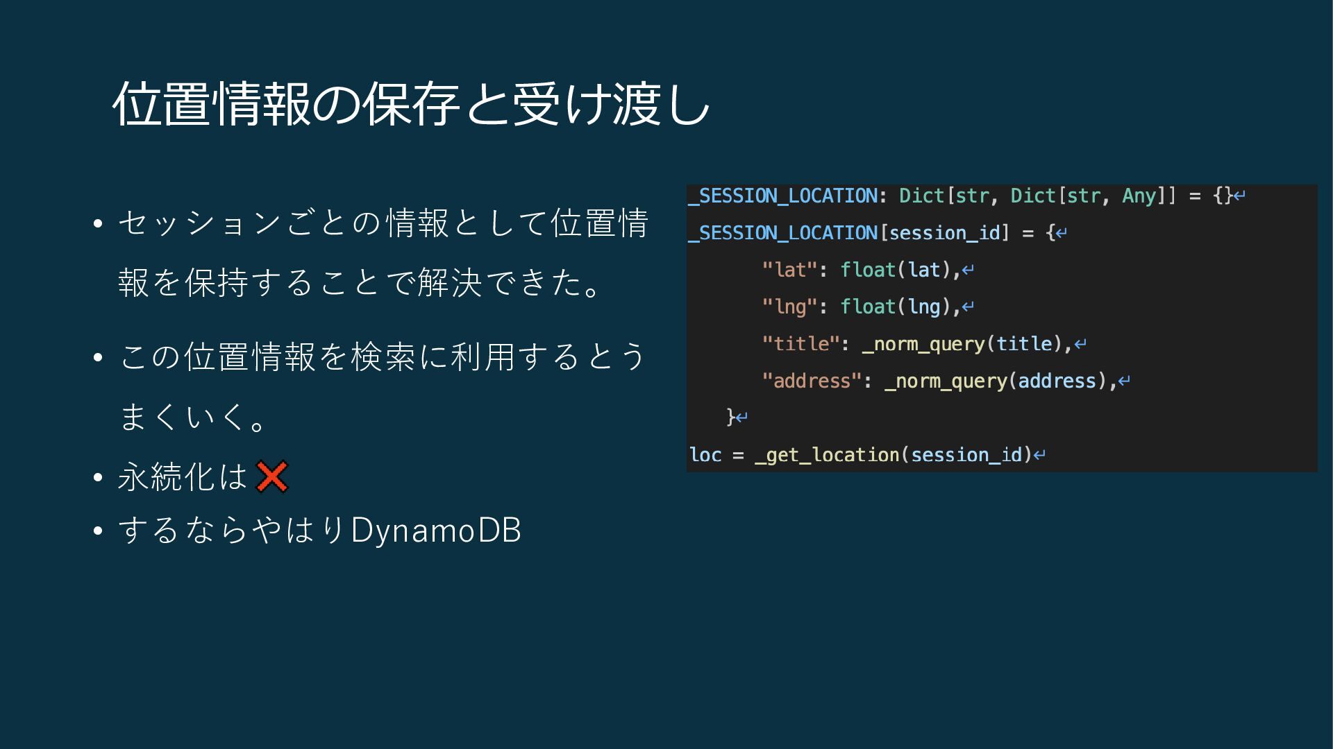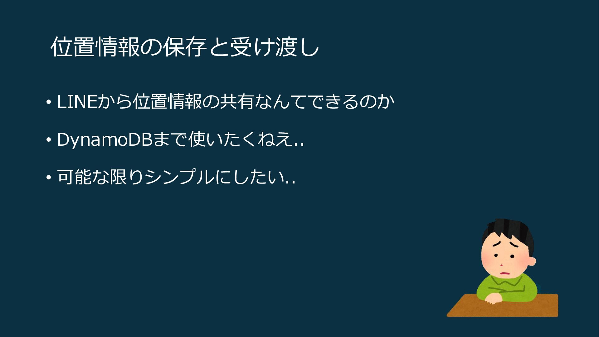 位置情報の保存と受け渡し • LINEから位置情報の共有なんてできるのか • DynamoDBまで使いたくねえ.. • 可能な限りシンプルにしたい..